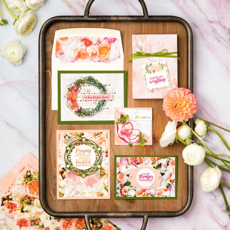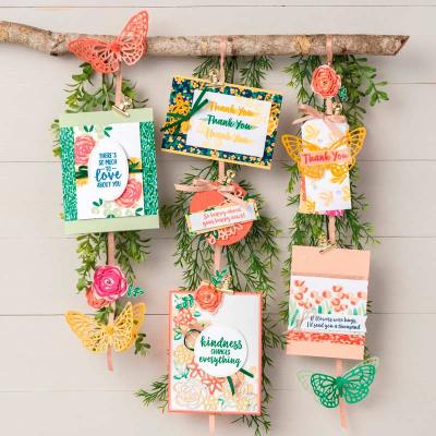 There are actually two different designs used in this project from the Garden Impressions DSP. Every single sheet of this set is so beautiful — and colors are just gorgeous in person! I actually used one design for the butterfly itself, cutting it on the Big Shot with the Springtime Impressions Thinlits Dies. Then used a pretty floral one for the background, along with Blueberry Bushel and Soft Sea Form cardstock.