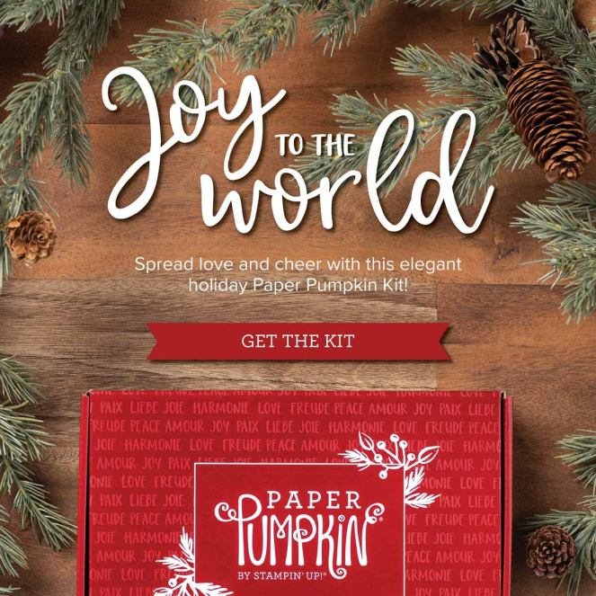 Get ready for a joyful delivery in your mailbox! A specially-themed red box and supplies for 8 elegant cards are just what you need to get your festive spirit ready for this holiday season. The exclusive “Joy to the World” Paper Pumpkin Kit also offers a fun and unique opportunity to connect with the global Stampin’ Up! community.