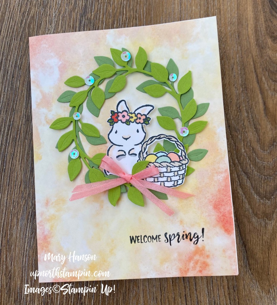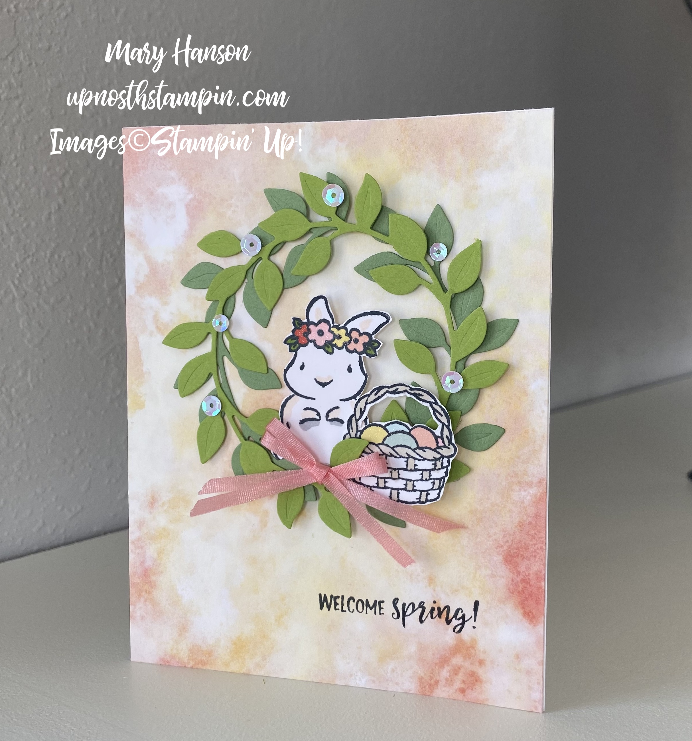 I tucked the bunny and basket into the wreath and adhered with Glue Dots. I attached a double bow of ribbon and stamped the sentiment right onto the card base. The Springtime Joy stamp set is perfect for all kinds of spring occasions, as well as birthday or new baby!