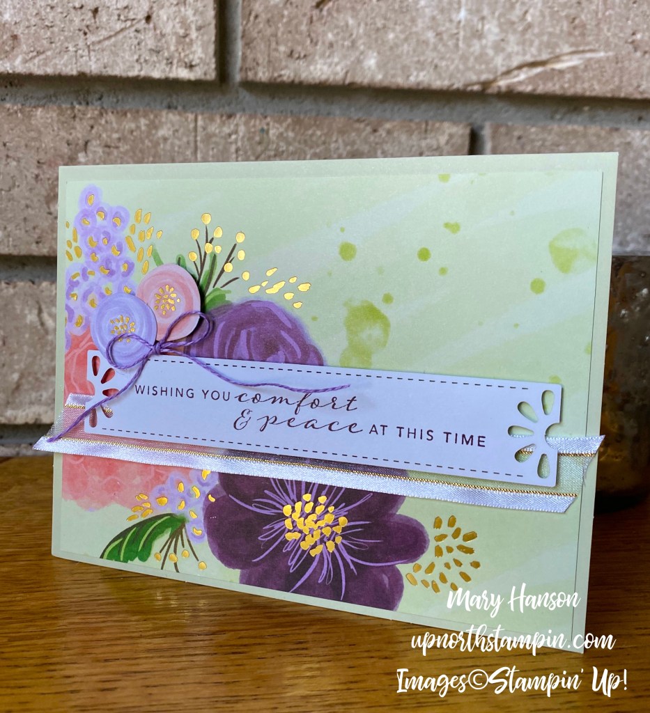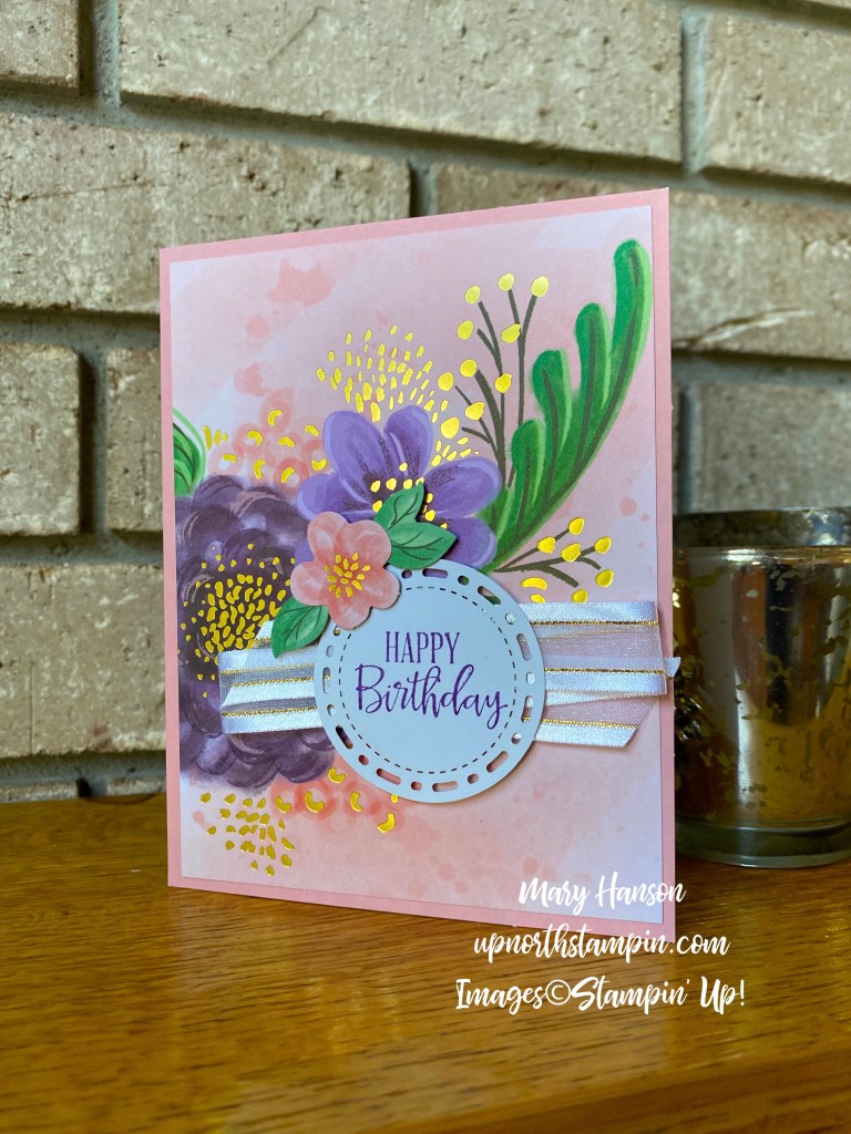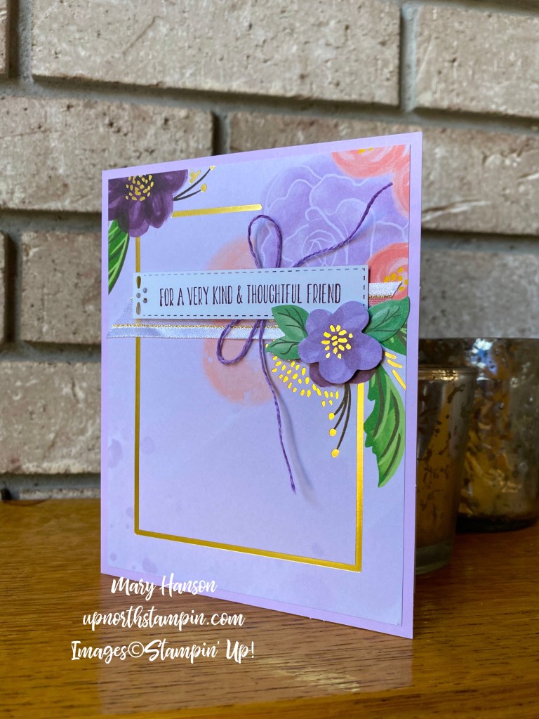 I love our Stampin’ Up! kits. They’re high quality, coordinating, and beautiful. The Gorgeous Posies kit is no exception. Look at these yummy colors, and all the ingredients you get in our kit — enough to make 16 cards, four of four different designs, complete with gold foil accents.