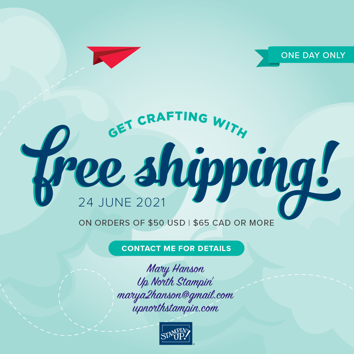 Hi, Friends! It’s here — the 24-Hour Stampin’ Up! FREE SHIPPING SALE! Take Advantage of this day. We all know shipping can be pricey, no matter what we are sending or buying, and today, you don’t have to worry about it! Yay!!