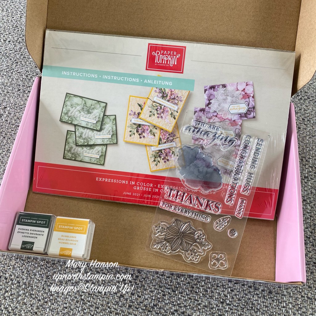 The “Expressions In Color” June Paper Pumpkin came in a special box — its focus is on the five new 2021-23 Stampin’ Up! In Colors! Doesn’t it make you want to open it?
