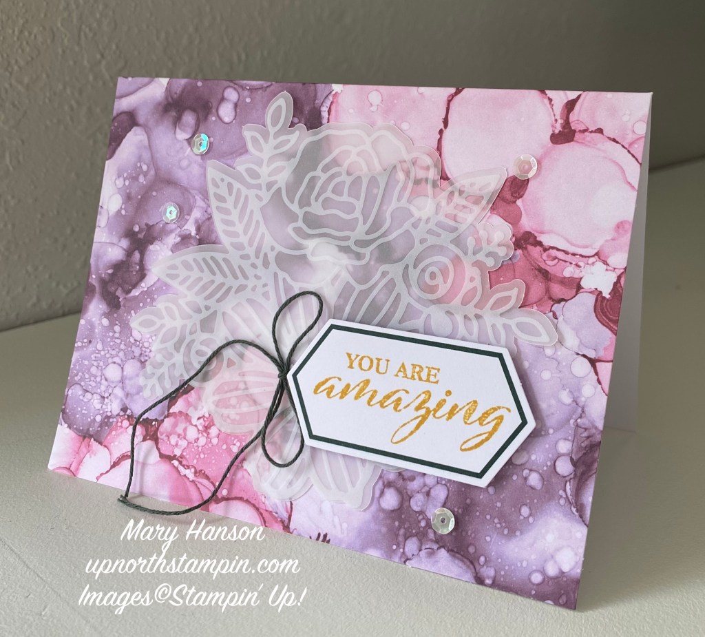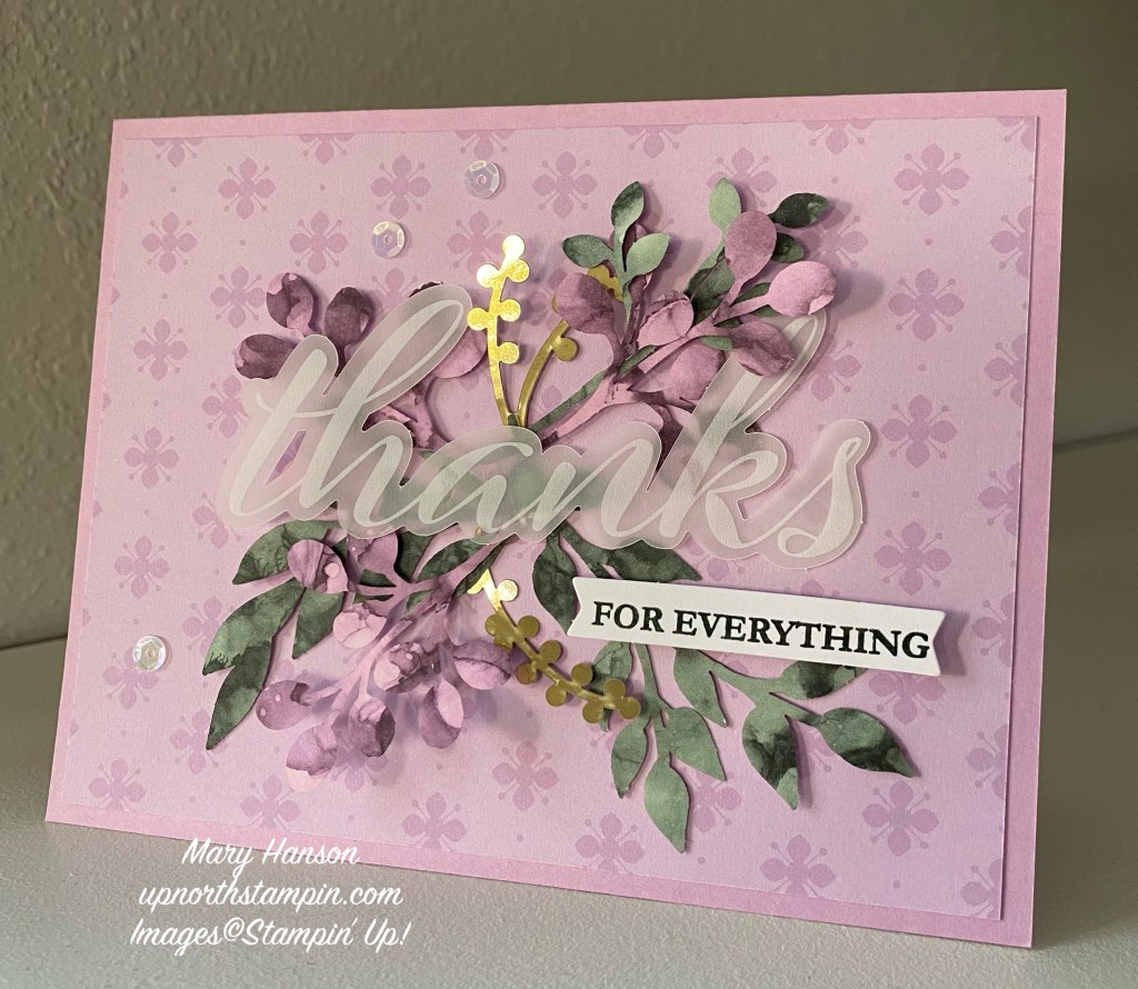 And here is am alternative design I did with some other ingredients. That’s the joy of Paper Pumpkin — you can make as instructed, or be creative and create your own designs! This card was inspired by Katie Brown with SeaBreeze Stamping with Katie. I used a card base of Fresh Freesia, and added to that a panel of Fresh Freesia Designer Series Paper. The gold accents are from the EXPRESSIONS IN INK EPHEMERA PACK, found in the new Stampin’ Up! annual catalog.