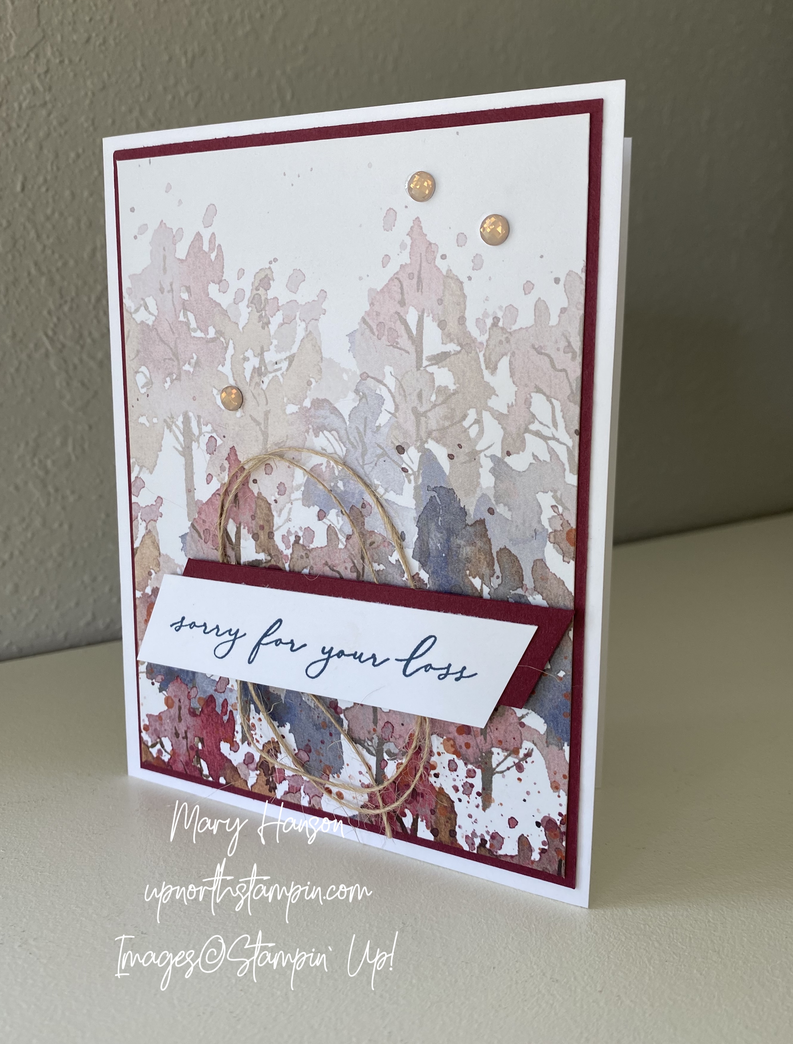 I used Cinnamon Cider for one card base, and Basic White for another Card base. The Misty Moonlight and Merry Merlot panels were cut at 5 1/4″ by 4″. Then I simply cut a panel of the DSP at 3 7/8″ by 5 1/8″. I adhered the two panels to the card base. The sentiment is from an older Sale-A-Bration stamp set called Heal Your Heart. I backed each sentiment panel with a little slice of coordinating cardstock, and popped them up with Stampin’ Dimensionals after having attached a few rounds of linen thread to the back. The embellishments are from the Elegant Faceted Gems. All the products I used for this project can be found at the bottom of this post.