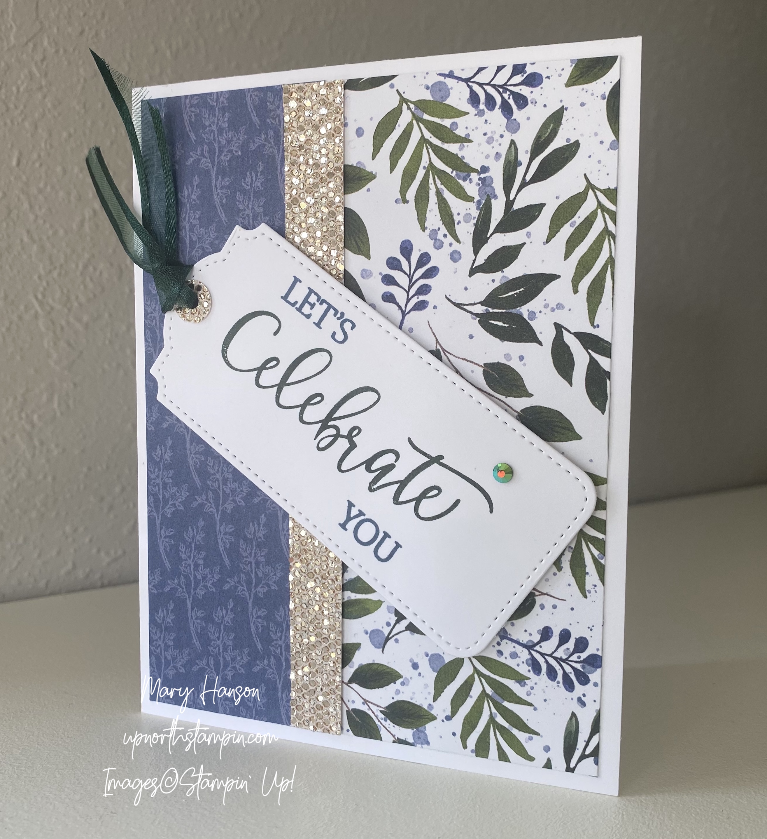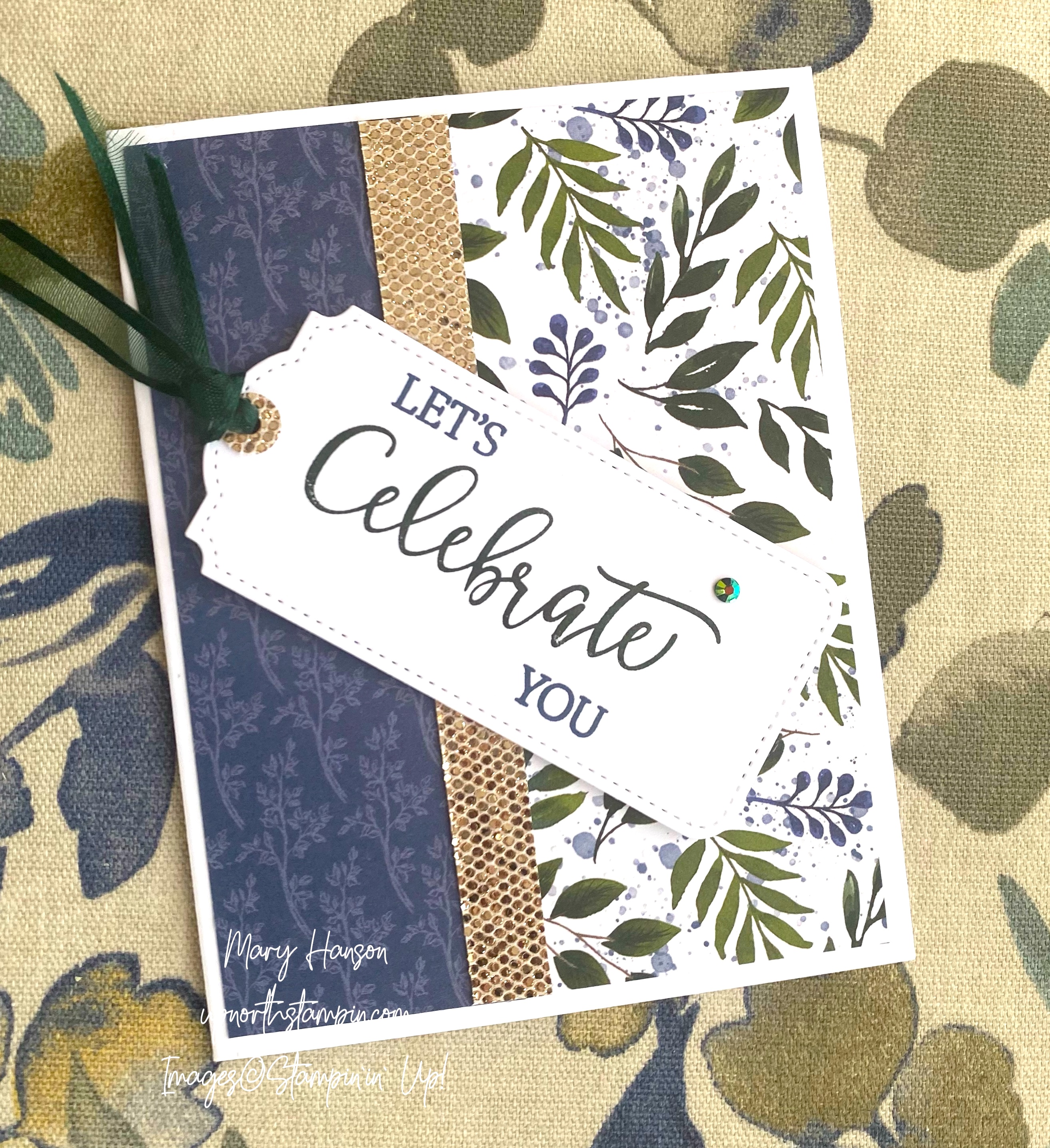 I used some of the beautiful papers from the Beauty of the Earth Designer Series Papers. They are a lovely mix of seasonal, watercolor-y papers that utilize rich colors. I also have a sneak peek of a new Sale-A-Bration product you can get for free! Here’s my card: