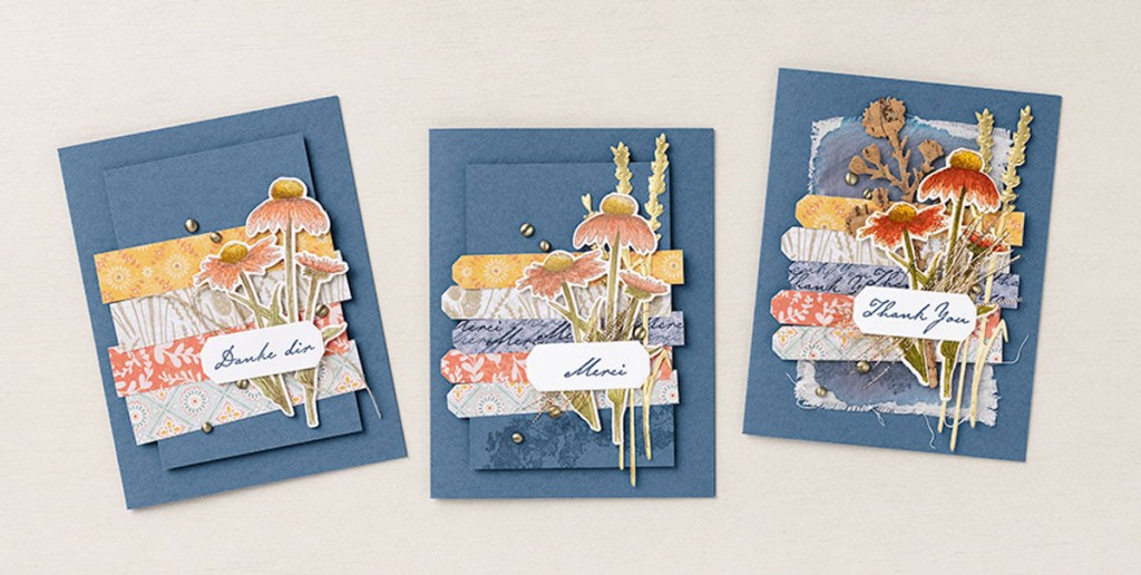 | AVID We’re a little bit in love with the Designer Series Paper combination on this card. And the look is so easy to achieve. Simply use the Harvest Dies to cut the strips of Designer Series Paper. Stamp “Merci” on one of the strips for one more pretty layer. Pull on the Gold 3/8″ (1 cm) Shimmer Ribbon edges to create a gorgeous accent. |