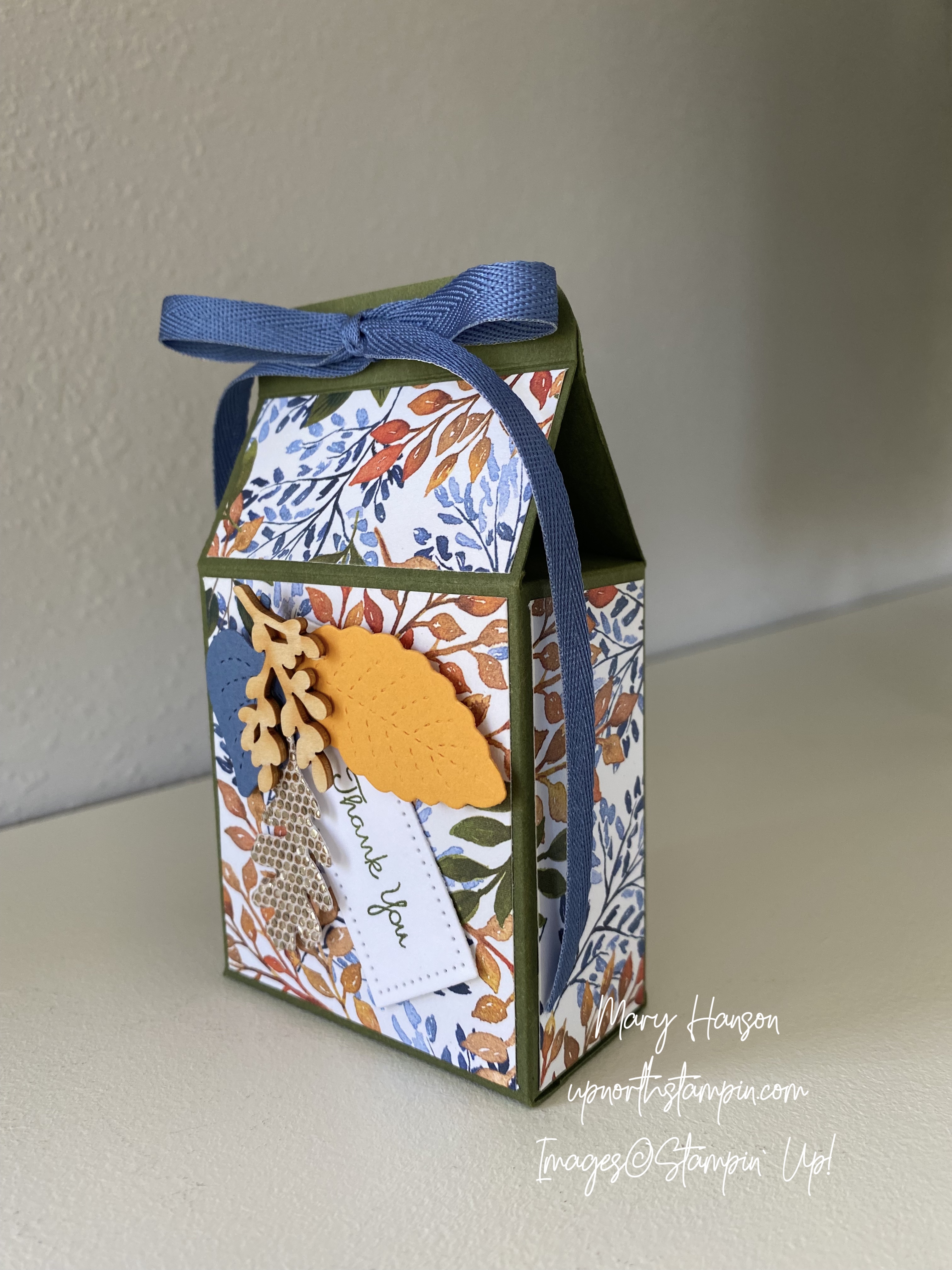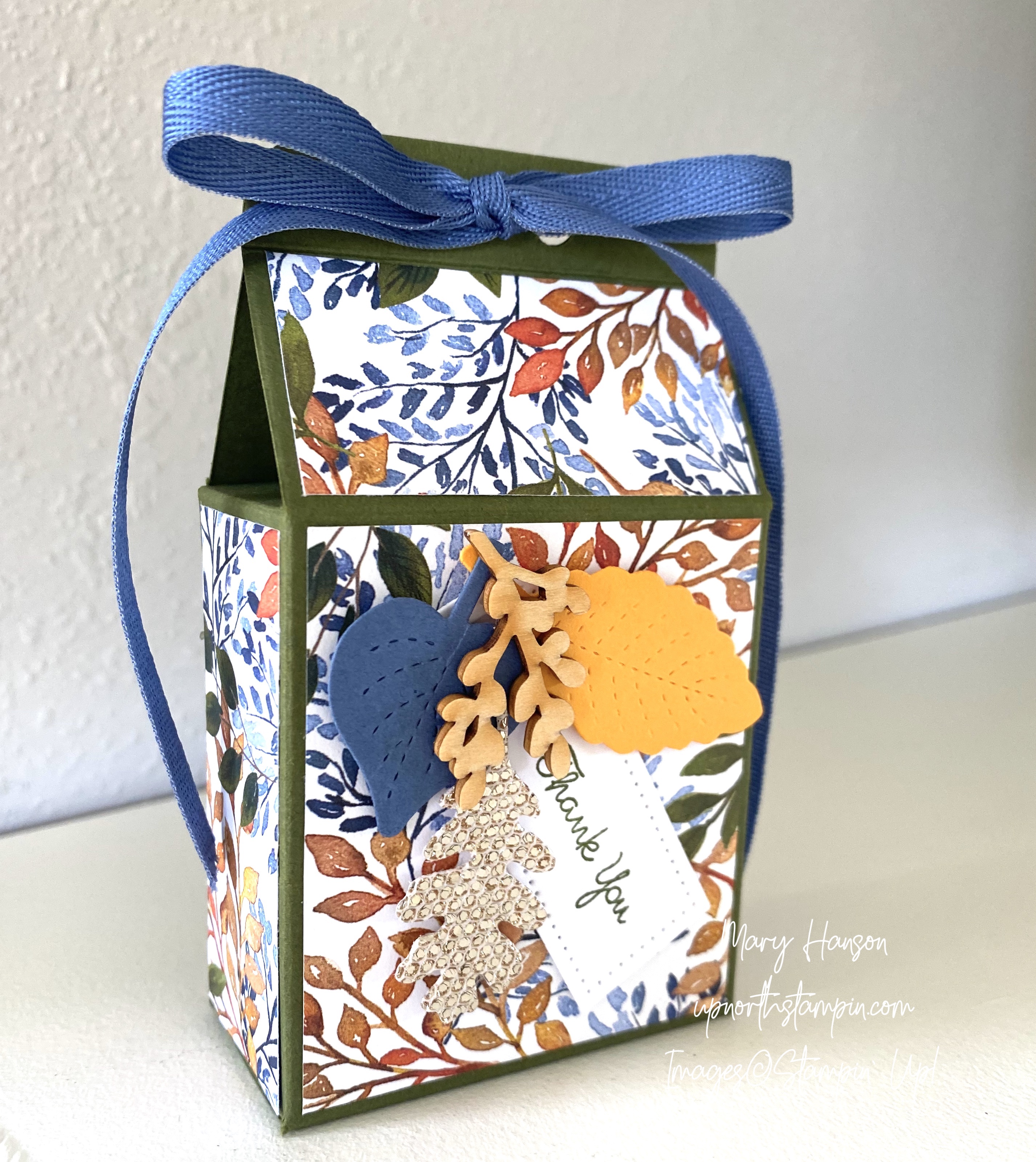 I then decorated the box! I cut leaves out of the Stitched Leaves dies in Mango Melody, Misty Moonlight, and one in the Be Dazzling specialty paper from Sale-A-Bration. I cut out a tag from the Tailor Made Tags Dies and stamped a sentiment on it in OId Olive. I used a small wood element that has retired to add a little more dimension to the front. I used a paper punch to create two holes at the top, and then tied the box with the ribbon after putting in the Oreo pack!