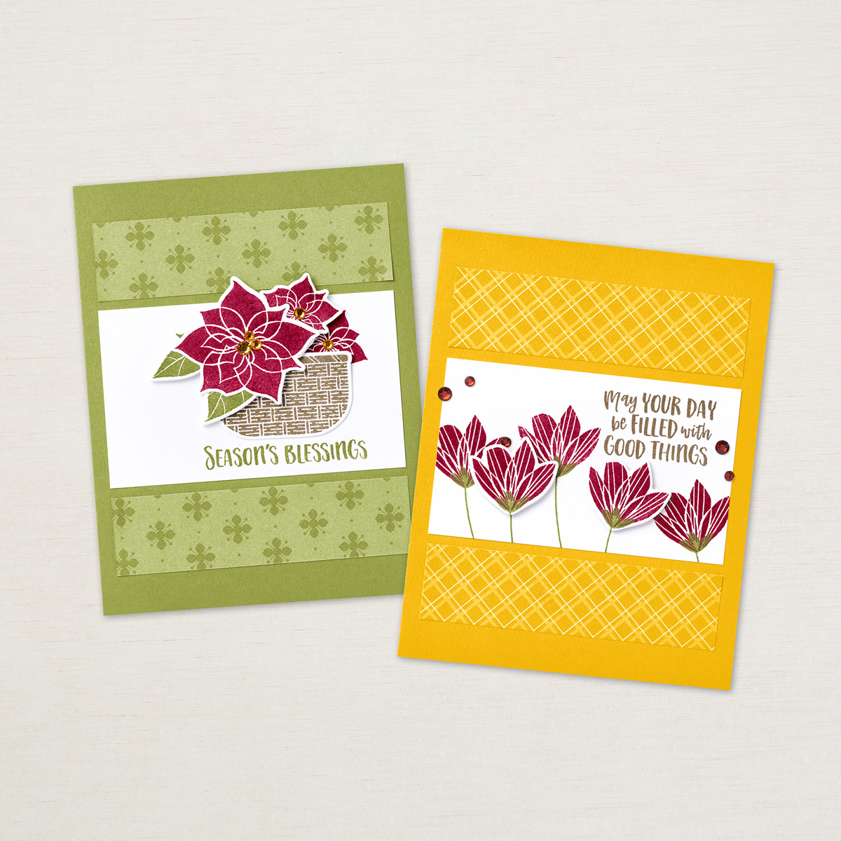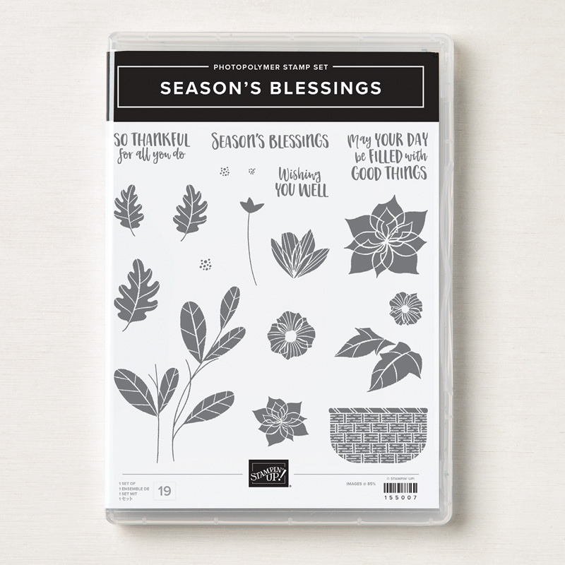 Let me introduce you to the Season’s Blessings Bundle. Stamp a basket full of poinsettias, add the “Season’s Blessings” sentiment, and you have festive holiday cards. But the fun doesn’t end there! Fill the basket with leaves stamped in reds, yellow, and oranges for autumn cards. Stamp colorful flowers and “May your day be filled with good things” for birthday cards. You can use the stamps in this bundle for almost any occasion.