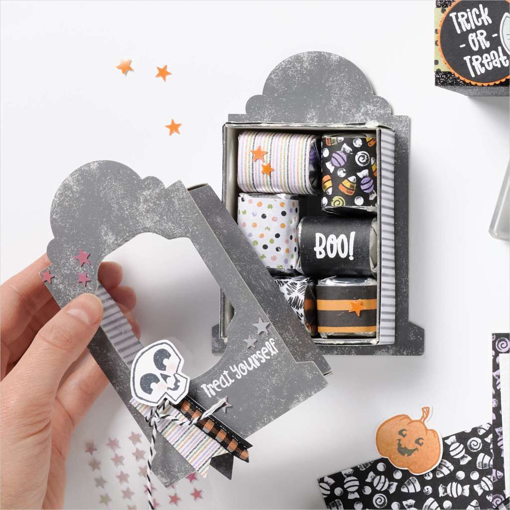 Looking for a cute treat idea for those special ‘ghoulies’ in your life? I have just the quick and easy solution — and economical! I used some little pieces I had sitting around from a couple of Paper Pumpkin kits, and I cut out some darling shapes from the new Cute Halloween Designer Series papers in the July-December Mini Catalog. Take a look: