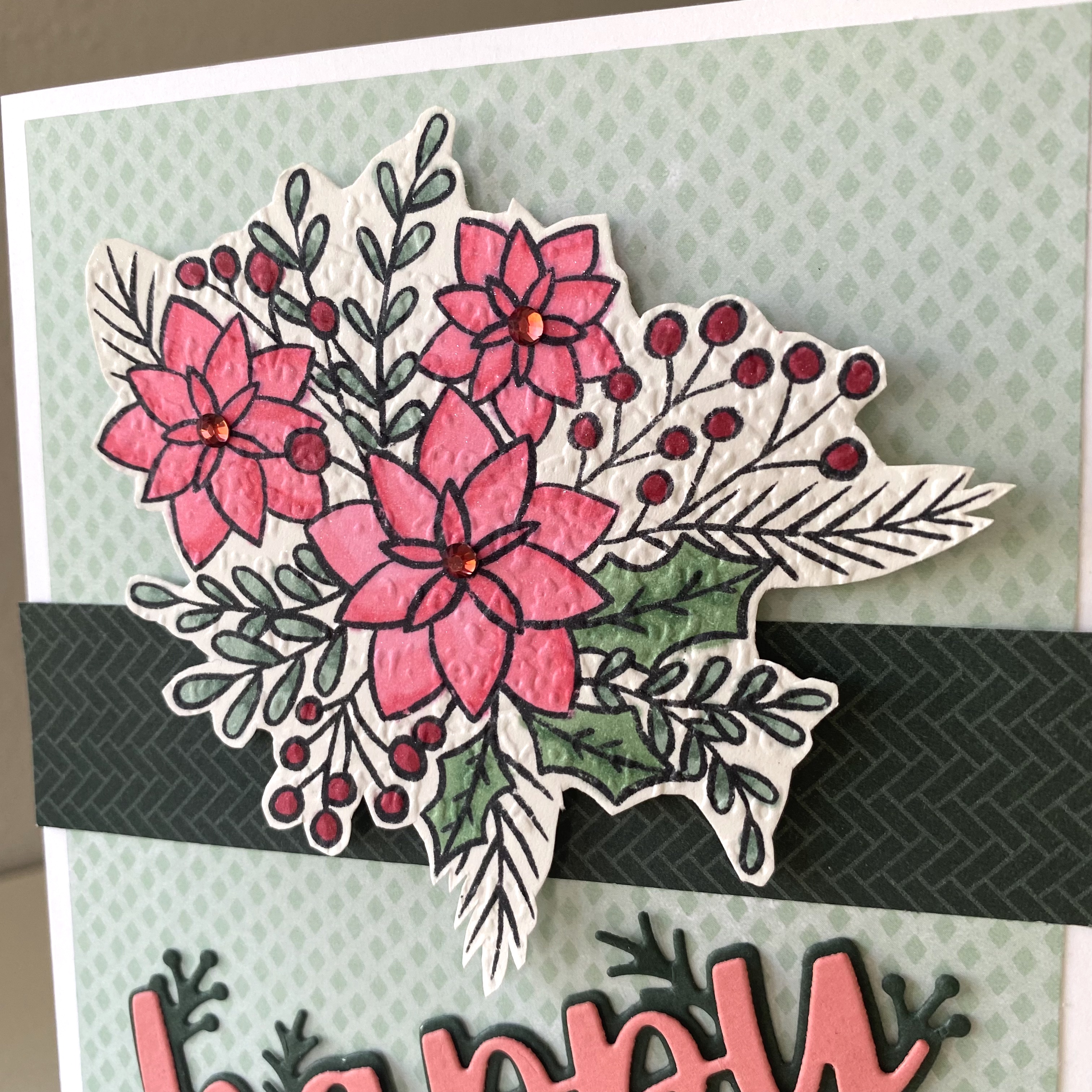 I cut out a Happy die in Flirty Flamingo and a piney background in Evening Evergreen card stock. I used the Holiday Rhinestones to create a little bling accent at the center of each flower. So easy and fun! Lastly, I stamped the HOLIDAY stamp directly onto the front of the card with Evening Evergreen ink.