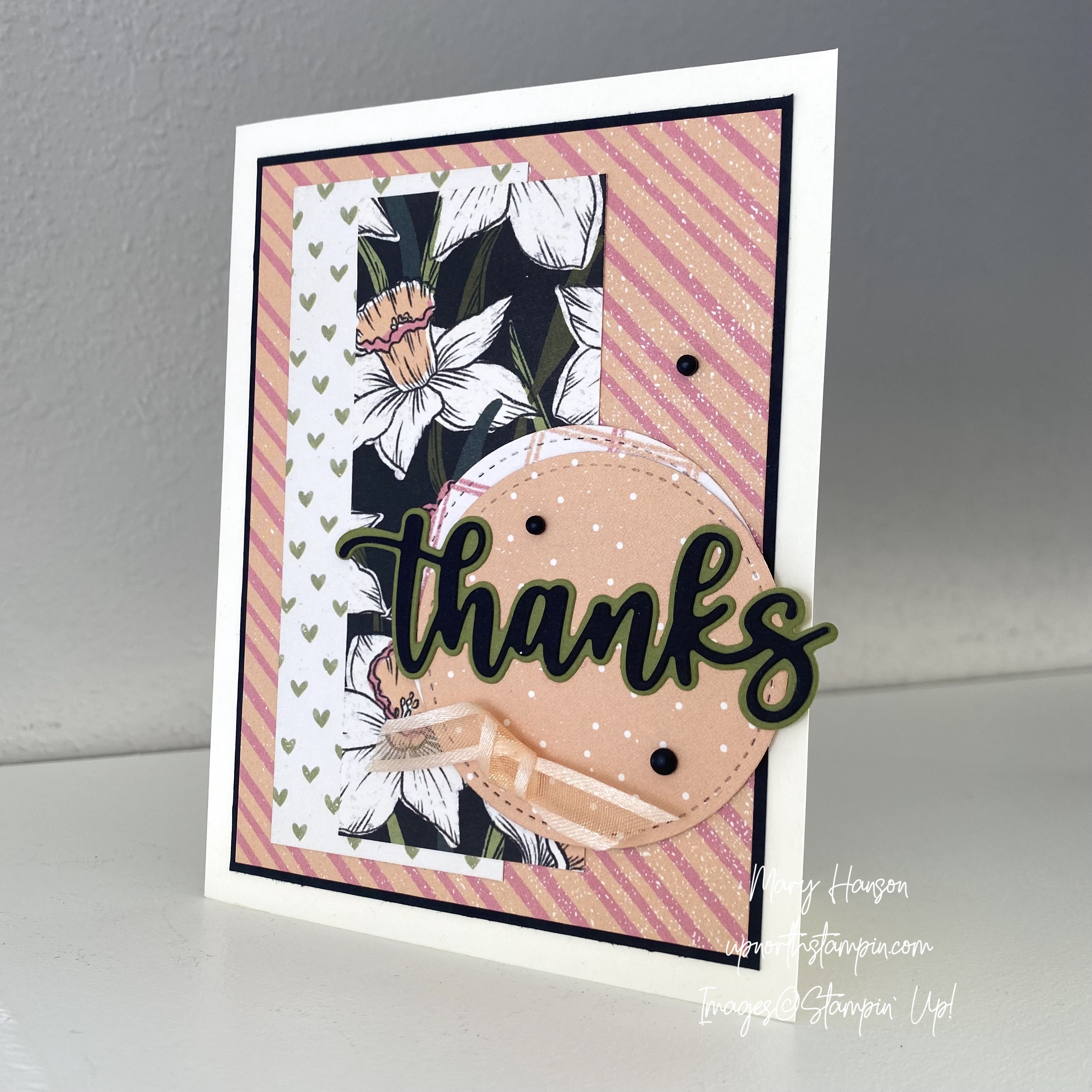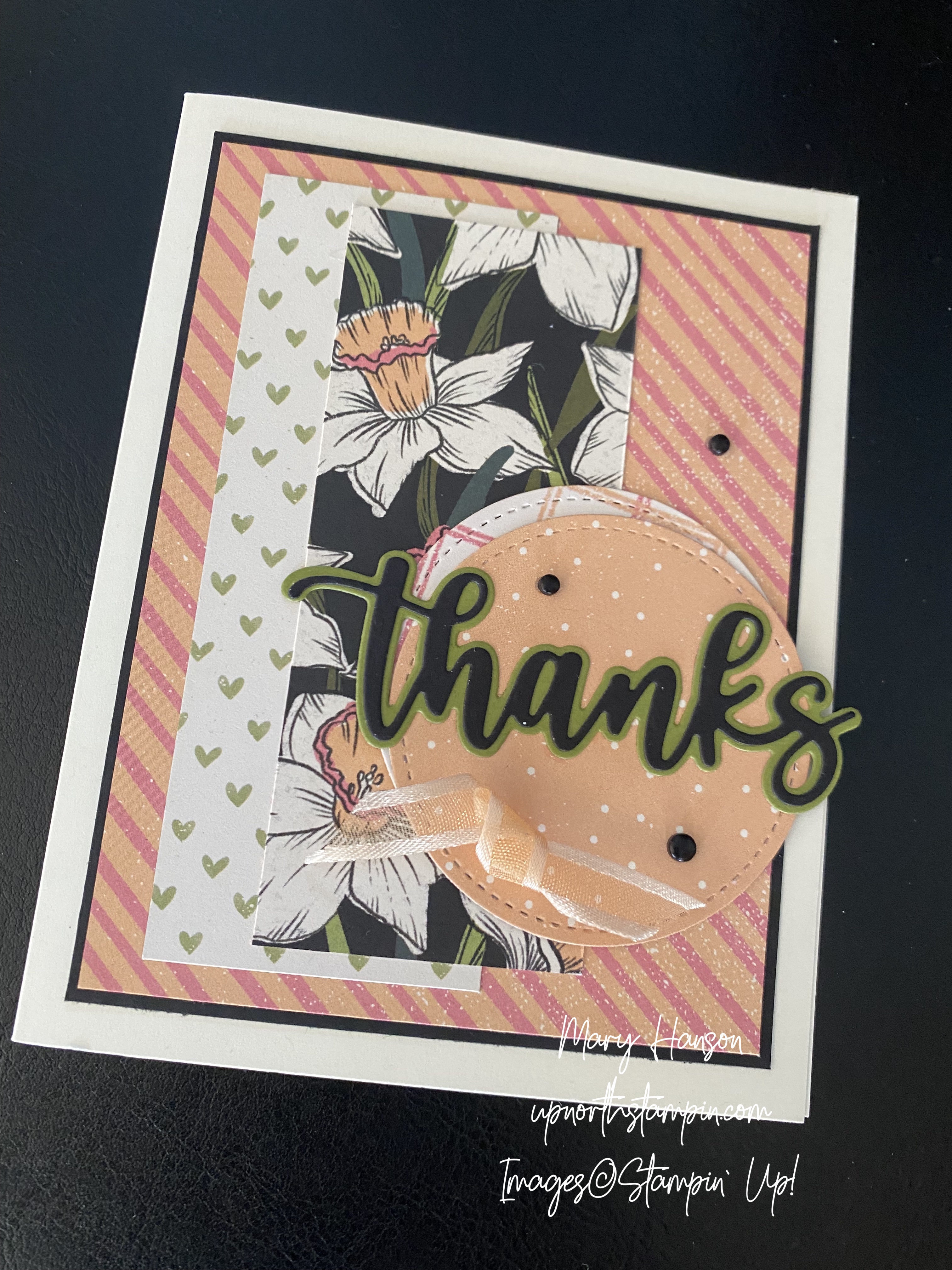 Once I got the wording glued onto the card, I added a small knot of Pale Papaya 3/8″ ribbon, and some Classic Matte Dots, and I was done! It’s fun to play with paper, and the Daffodil Afternoon DSP from our Sale-A-Bration brochure is a great way to do it!