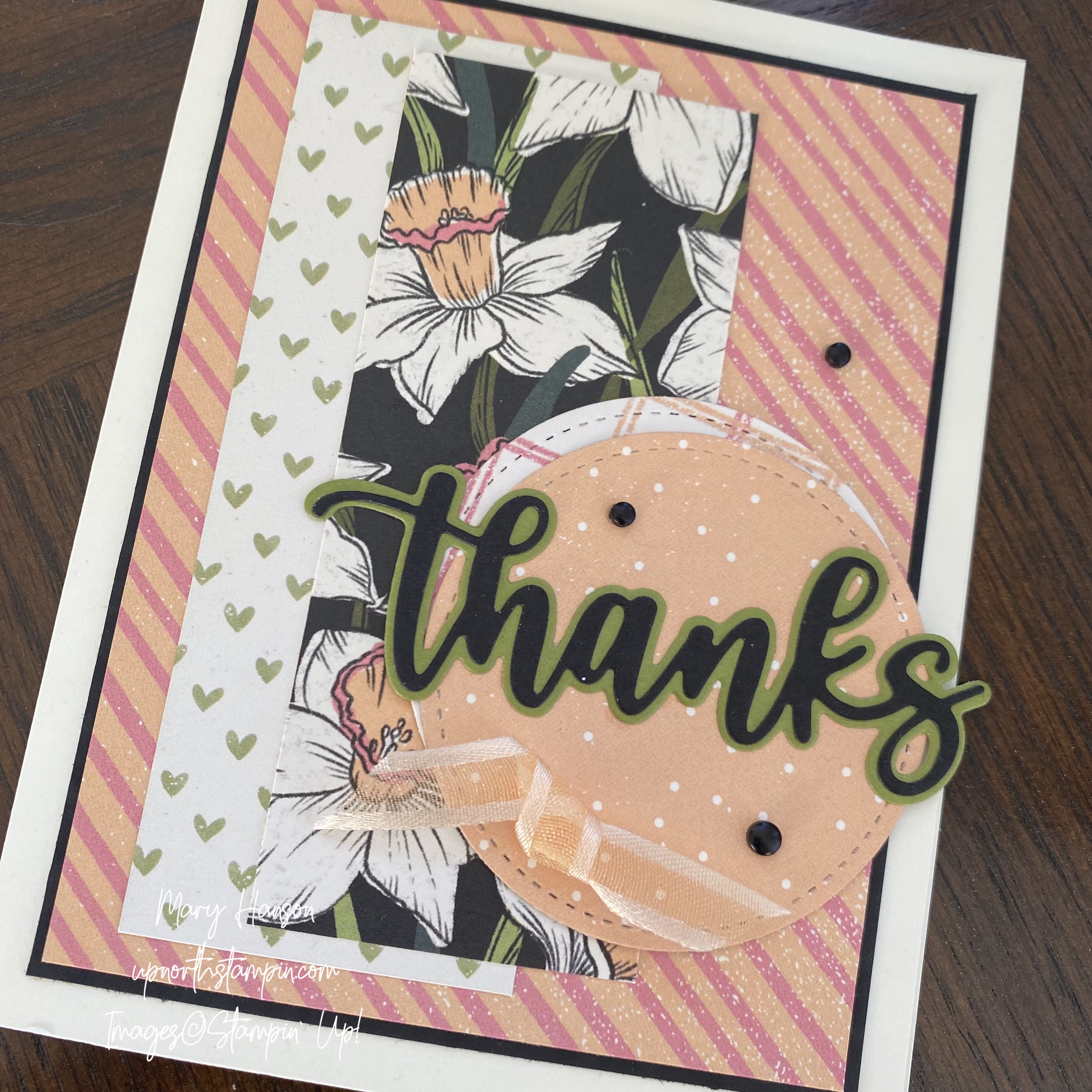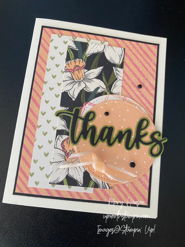 Okay, so here in Northern Minnesota, it’s definitely not daffodil time, but I AM enjoying using my FREE designer specialty papers from Stampin’ Up! Sale-A-Bration time, happening NOW, and found on p. 4 of the Sale-A-Bration brochure.