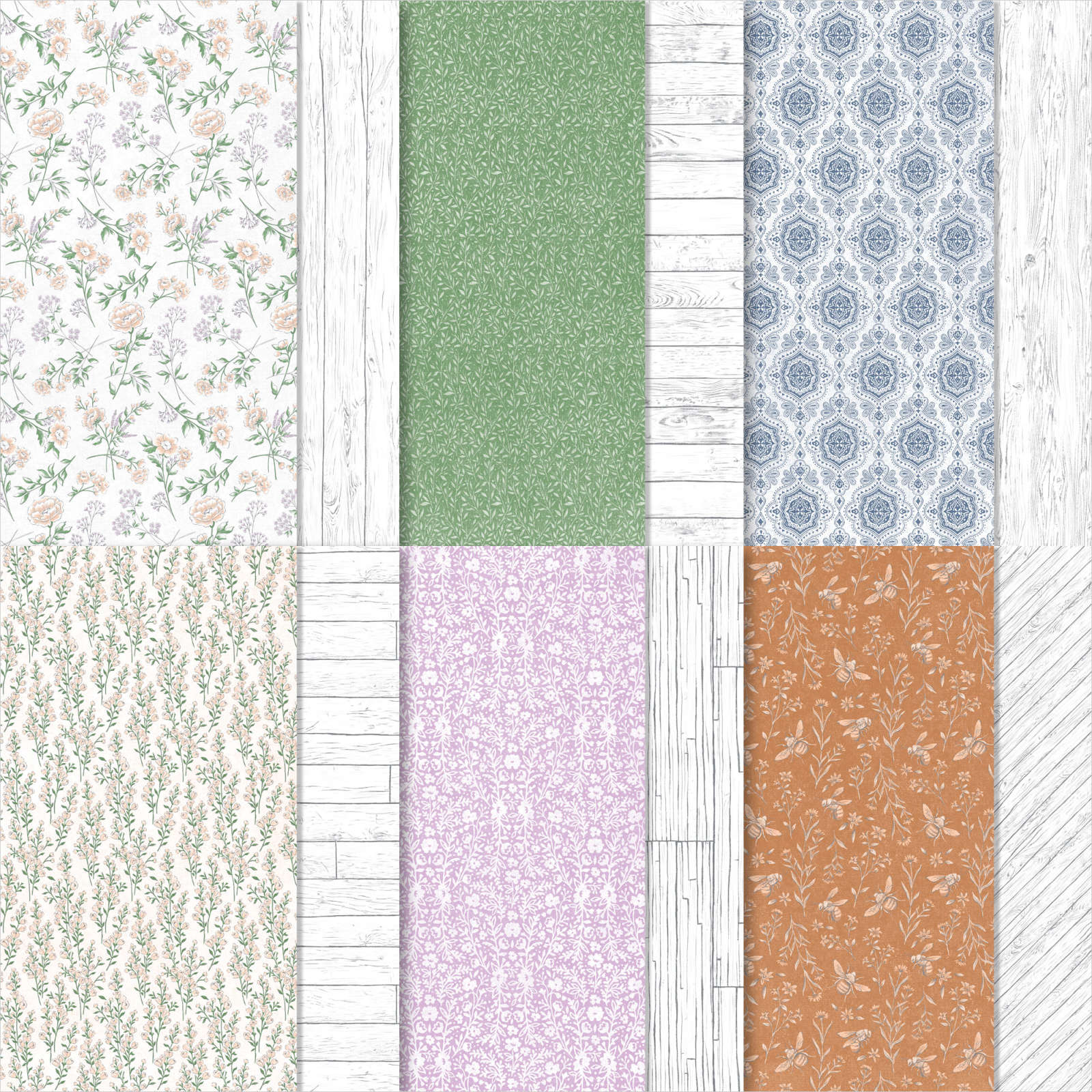 I then chose four patterns from the beautiful Heart & Home papers. With two patterns, I cut two strips at 1 1/2″ by approximately 4 1/2″ and 1 1/2″ by 4″. It’s really up to you how long you want to make them. I chose the other two patterns for my circle. The two circles are the same size, slightly offset, and are from the retired Stitched Shapes dies. I then assembled all the layers onto the card. Here are the beautiful papers you can choose from in this set: