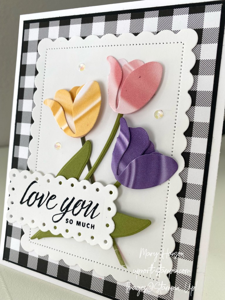 Hello, Stampers! It’s a sunny day here in northern Minnesota. Even though it’s cold outside, the sun through the windows brings some heat. Spring is aaaalllllllmost around the corner. This week, I continue to share cards made with the Flowering Tulips bundle.