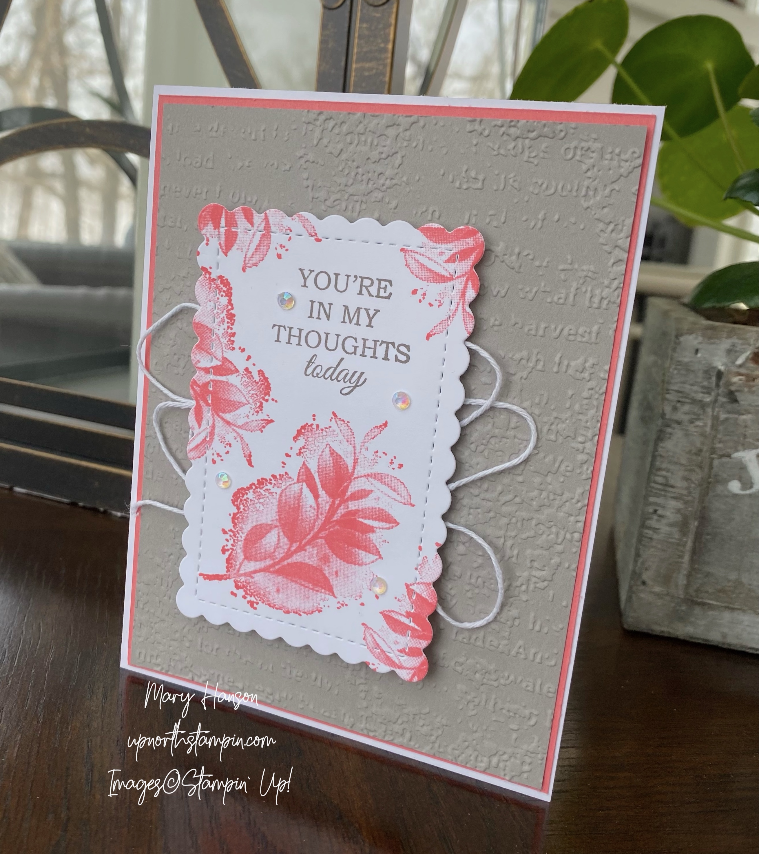 I used a Basic White card base, and then a panel of Flirty Flamingo just 1/8″ smaller at 5 3/8″ by 4 1/8″. Then I took a panel of Grey Granite, embossed with the Timeworn Type embossing Folder, measured at 5 1/4″ by 4″. I then used a panel of Basic White cardstock to crop out a die from the Scalloped Contours dies, and stamped a pretty sentiment in Gray Granite, and the around it, stamped the leaf pattern pattern in Flirty Flamingo ink. I flipped the white panel over, put some tape adhesive down, and then arranged some white baker’s twin so it would loop off both sides. I popped it up using Stampin’ Dimensionals, and then a couple of Iridescent Jewels to finish the card!