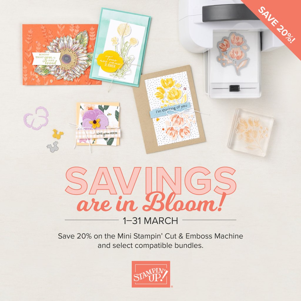 - A number of select stamp-and-die bundles that are compatible with the Mini Stampin’ Cut & Emboss Machine will also be available for purchase at a 20% discount.
