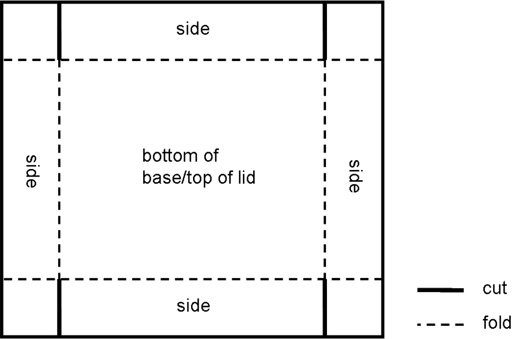 Then some slits were cut on two sides, opposite of each other, only one-inch cuts up to the next scoreline. Here is a graphic — the dark lines are scissor cuts.