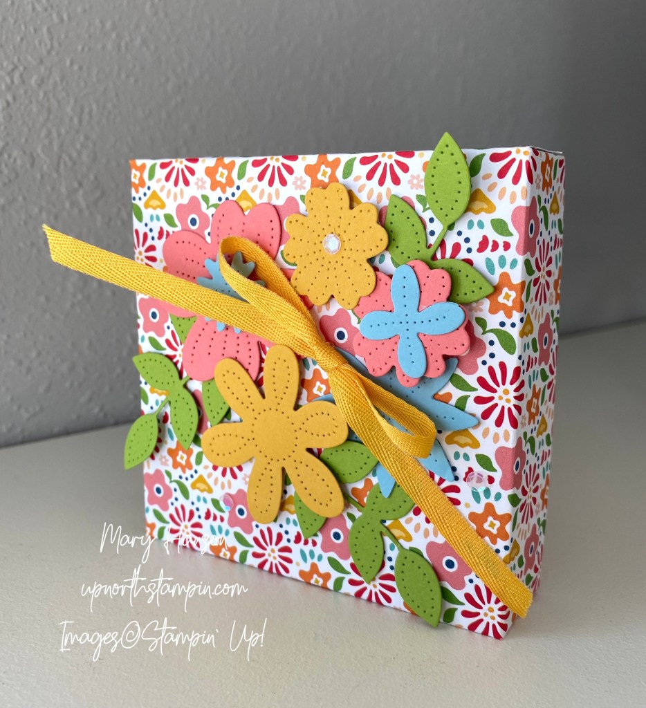 At our recent Pals Online Meeting, we learned how to make custom boxes to fit specific gift items we might be giving. So fun! Tammy Beard, fellow Stampin’ Pal, did such a great job of showing us how to create these fun boxes. For example, I made this box that fits a roll or two of our Stampin’ Up! ribbons!
