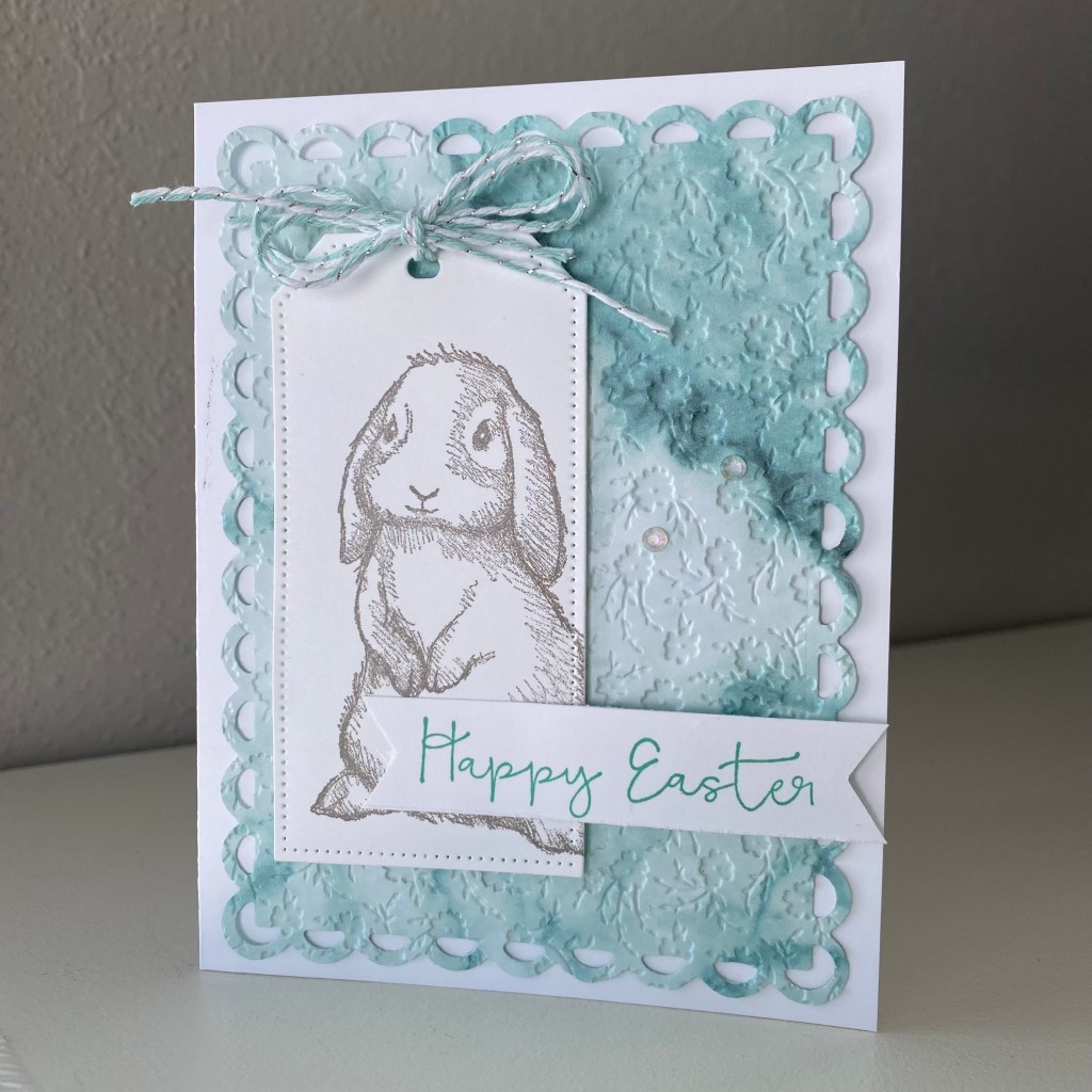 I then cut out a tag from the Tailor Made Tags dies (the largest one), and stamped the bunny image on it in Grey Granite. I tied a double bow with some retired baker’s twine, and then adhered it to the front of the card.