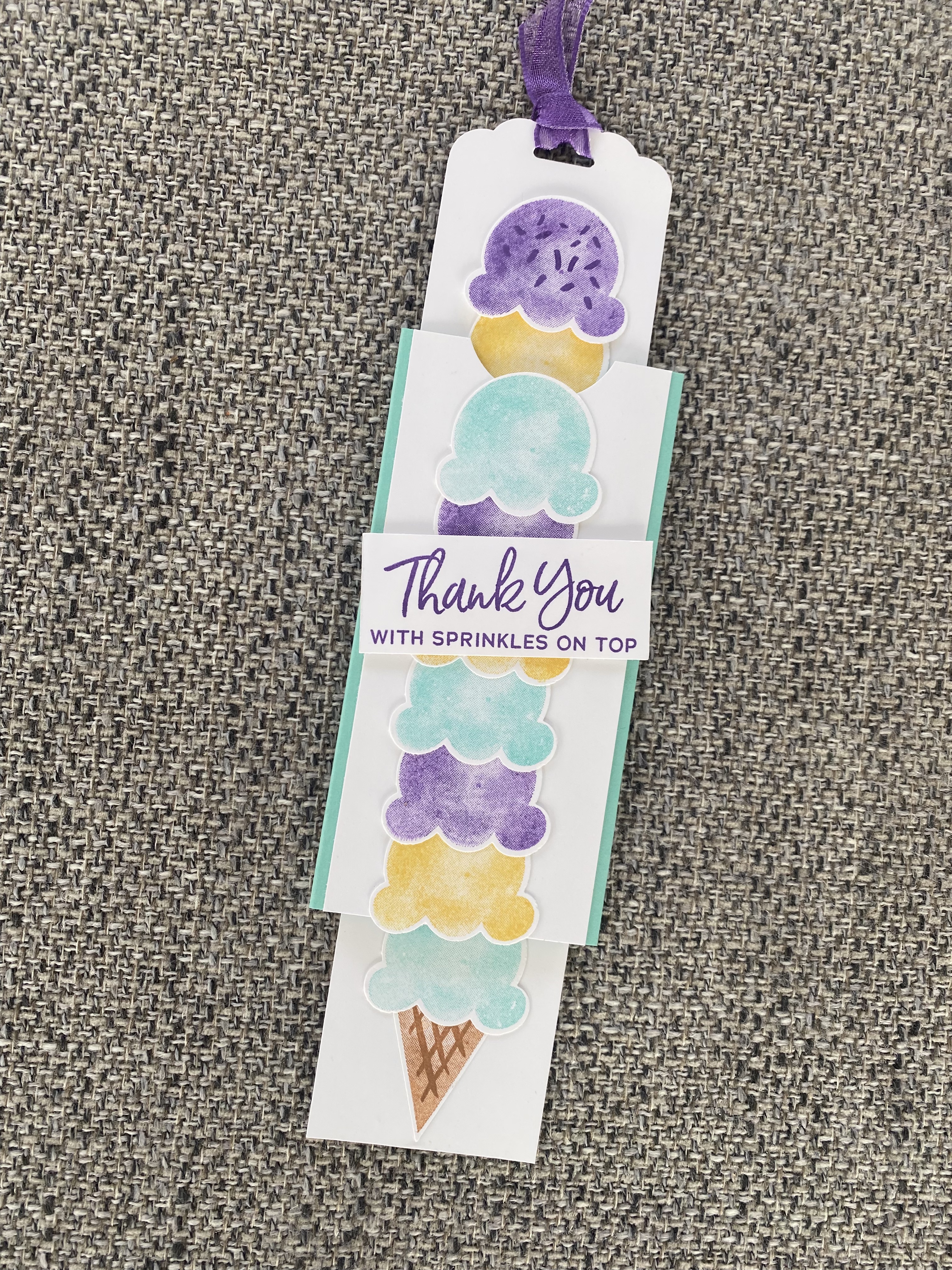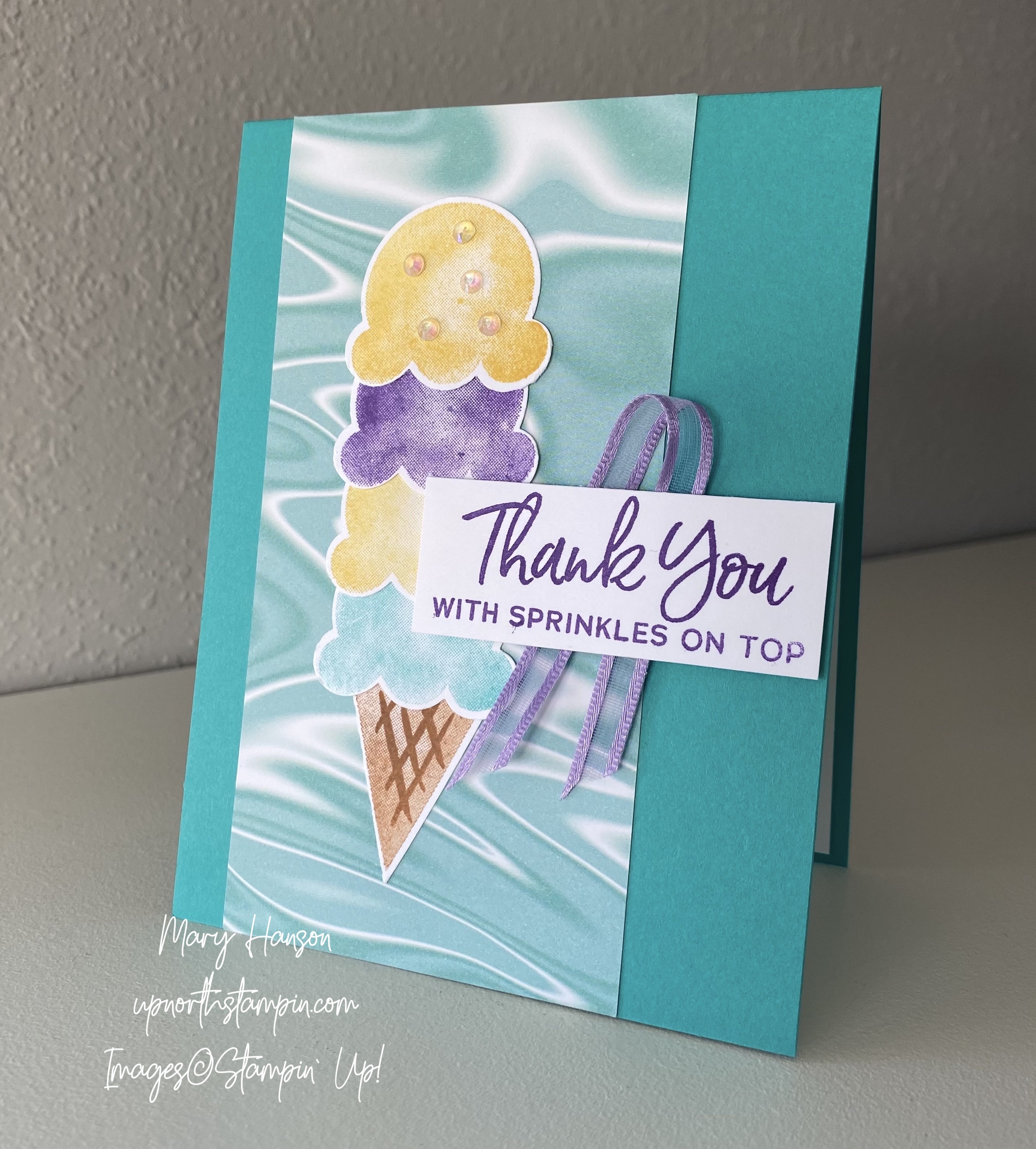Any way you want to say it, the Ice Cream Cone Builder Punch is on sale NOW for only $9.00 — that’s half price — and the Sweet Ice Cream photopolymer stamp set is on sale NOW for only $13.60. This little pair is a keeper, with so many possibilities, but it will sell out, and fast! Here are some fun projects I have made with my bundle, starting with this cute pair of thank you cards!