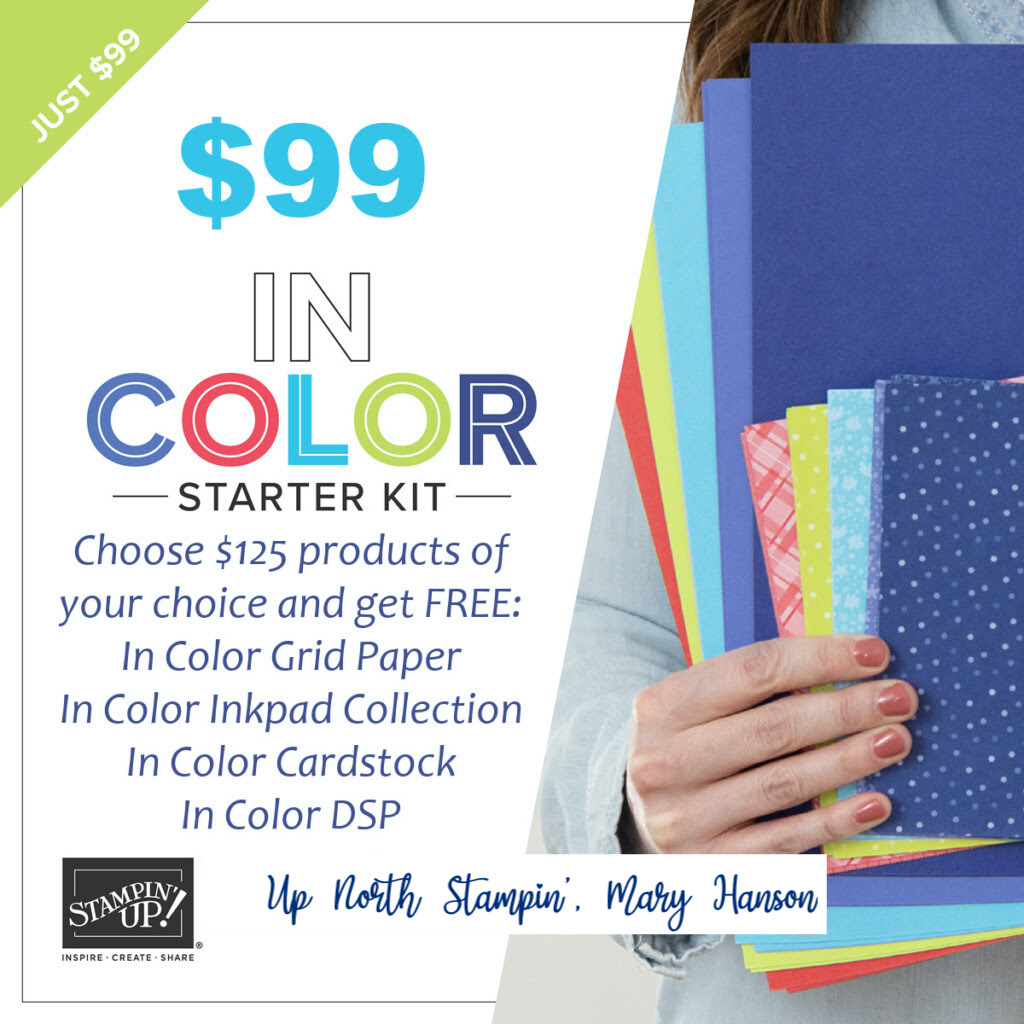 Get the products you love at the lowest price! Now’s the time to do it for yourself. Take advantage of the In Color Starter Kit Special for only $99 and get $191.50 worth of Stampin’ Up! products, including lots of new In Color products!