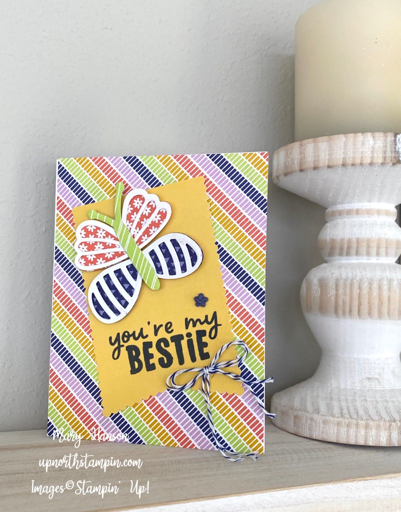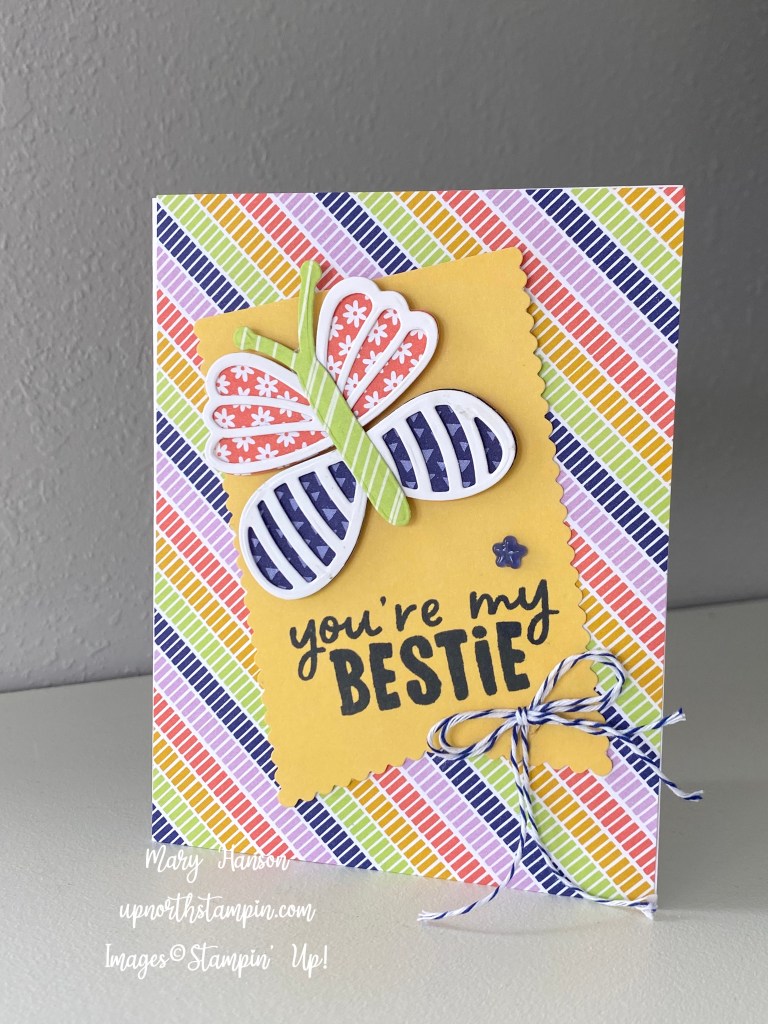 Both cards start with a 5 1/2″ x 4 1/4″ panel of Butterfly Kisses Designer Series Papers. For the top card I then built a butterfly using the dies, creating a white-outline with a pattern underneath. I adhered that butterfly onto a Bumblebee banner, and stamped a sentiment in Night of Navy. I then added a bow using the 2022-24 In Color Baker’s Twine. Easy and fun!