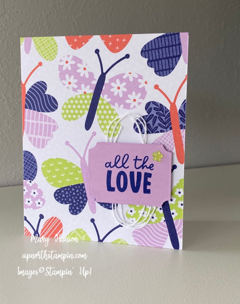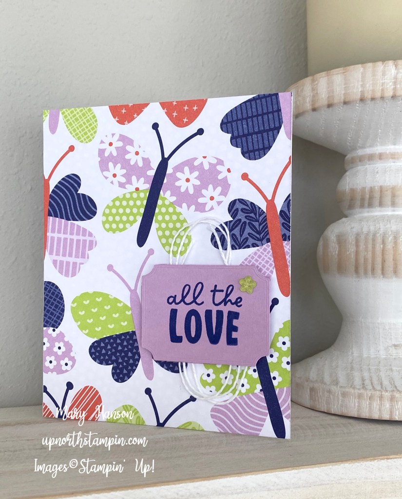 Your spring and summer card designs are all taken care of in this beautiful Suite Collection called Butterfly Kisses. I fell in love with it the moment I saw it in the new Annual Stampin’ Up! Catalog. Today I’m featuring two simple cards that you can make in no time, both relying heavily on the CUTE Designer Series Papers: