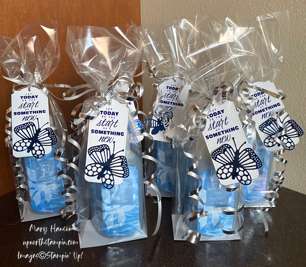 I then used some silver curling ribbon to adhere the tag to the cellophane bag, and I was basically done. The blue butterflies shine so beautifully, and add a pretty touch to these feminine packages!
