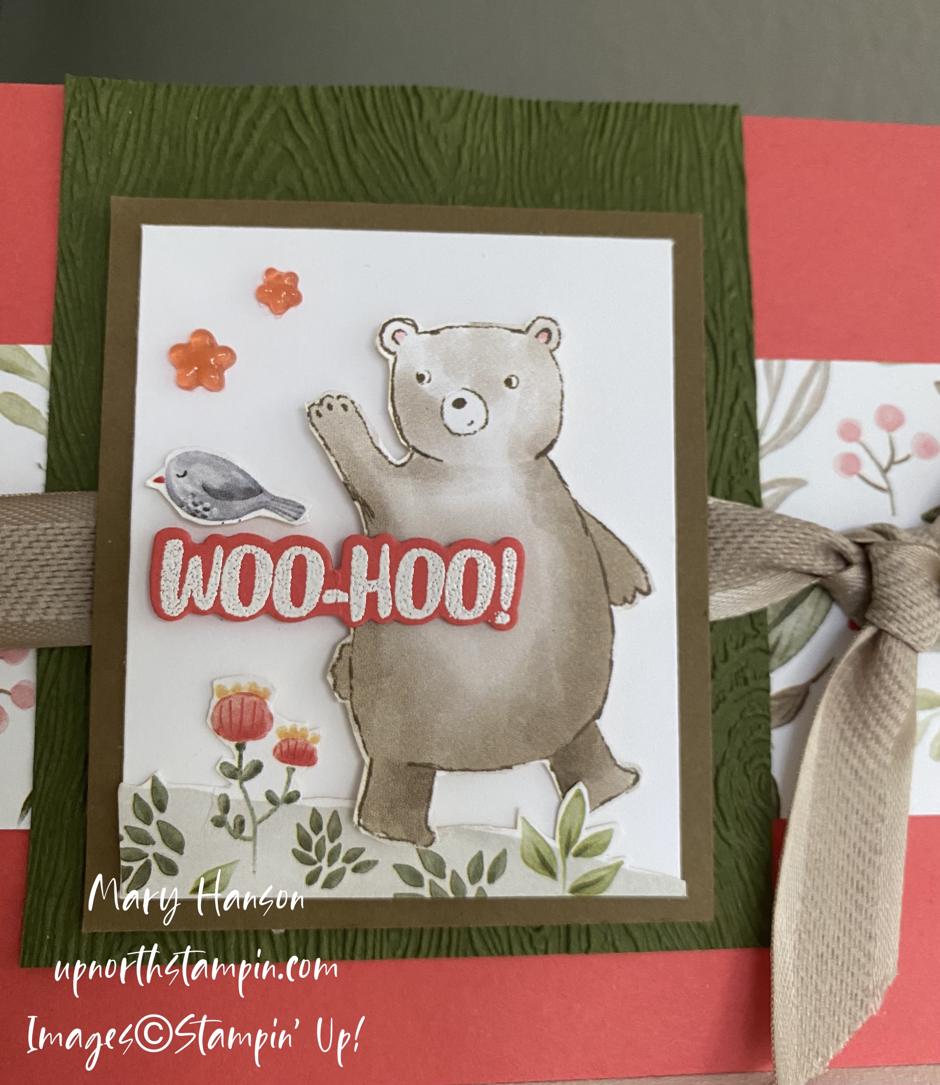 I created a fun little challenge card, utilizing some darling new Designer Papers called “Happy Forest Friends!” Isn’t it fun? Who wouldn’t smile when they received that sweet bear in the mail?