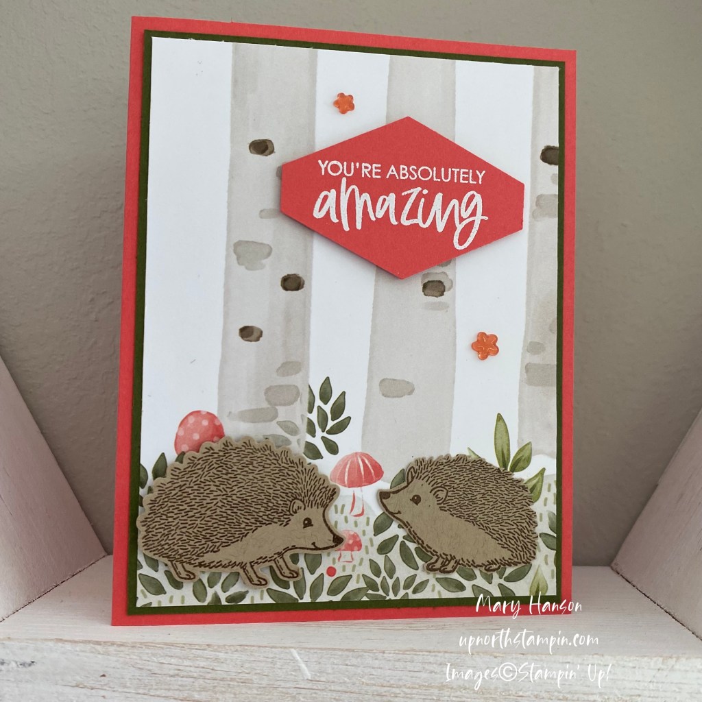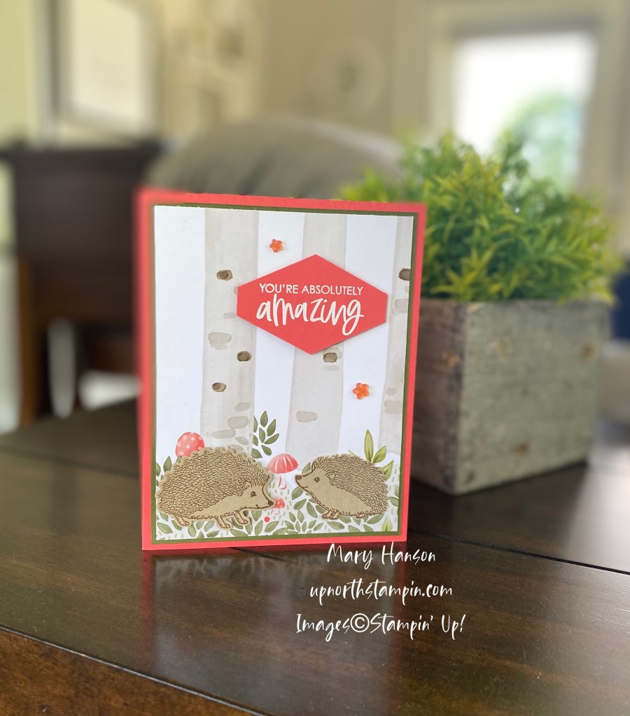 I knew I had to have the Happy Hedgehogs Bundle the moment I saw it in the Stampin’ Up! Catalog. These little guys just make me so….well, happy! I created a card with a cute and woodsy background that was so easy!