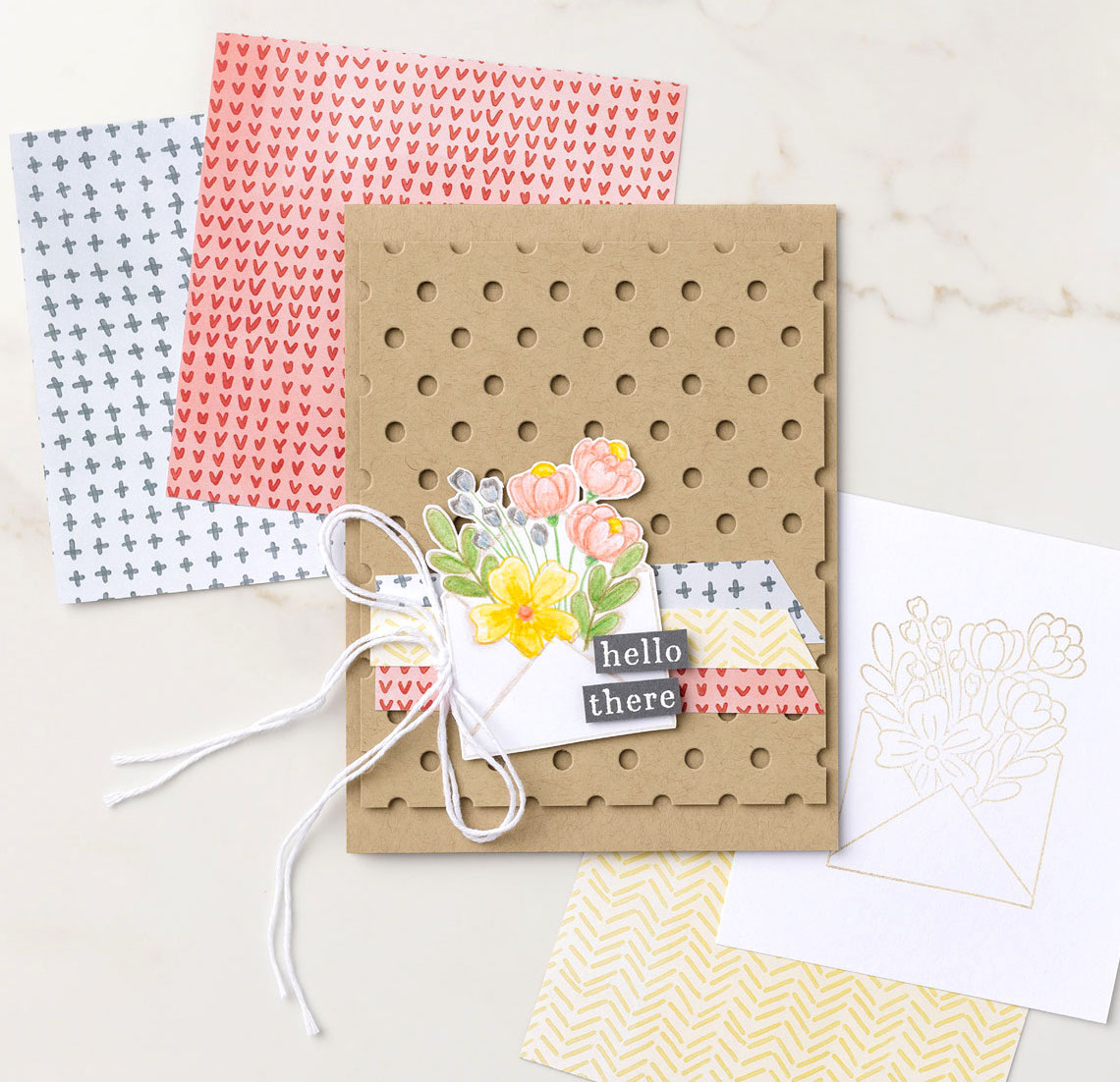 There’s a cute new stamp set in the Stampin’ Up! Annual Catalog called “Full of Love.” In this card, the stamp set is combined with a new single die called “Spots and Dots” for a sweet effect: