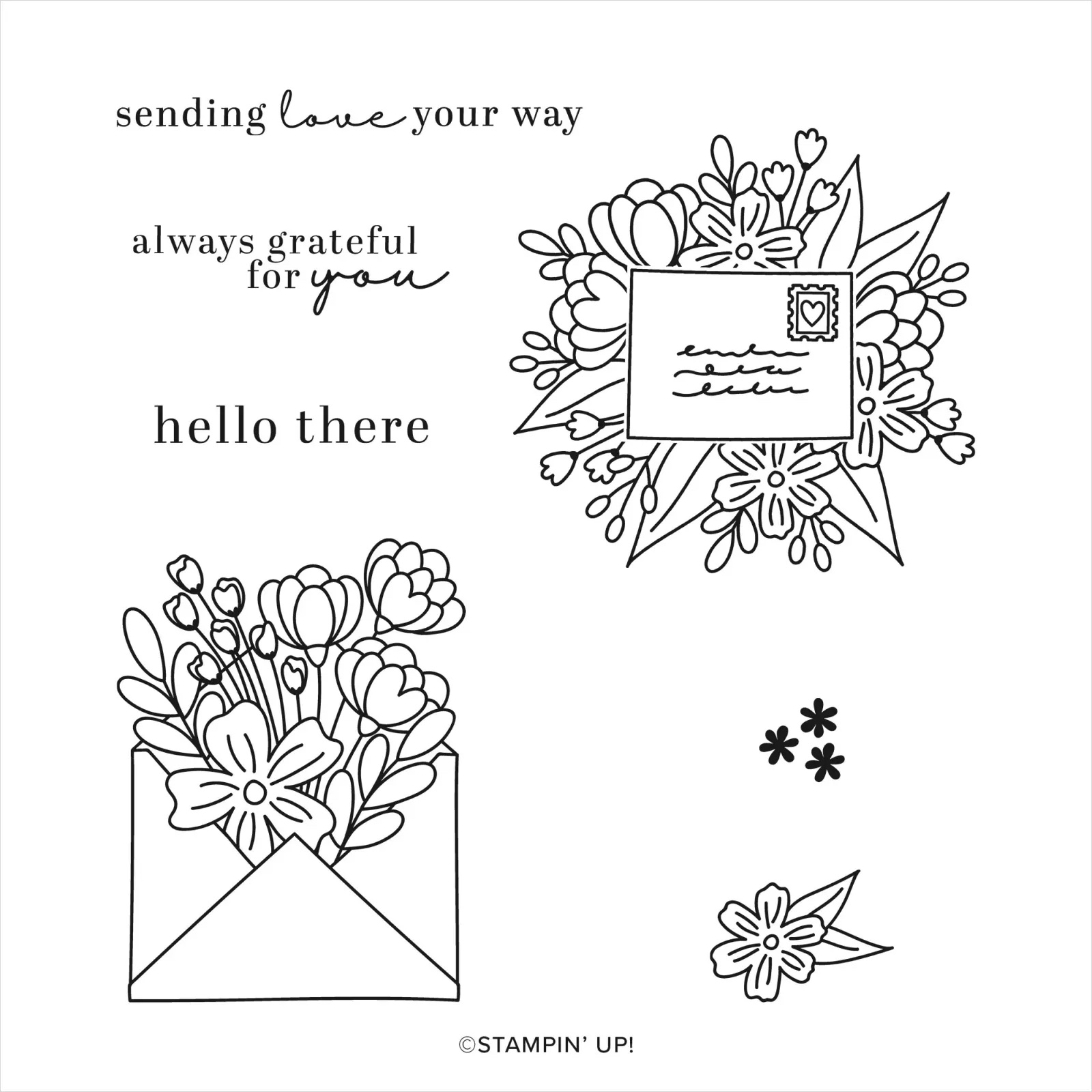 The Full of Love stamp set has simple and cute images like the one in this card. You can choose Watercolor Pencils, Stampin’ Blends, or whatever you’d like to color in your cute little envelope image, and then cut out with a scissors. Here’s the stamp set.