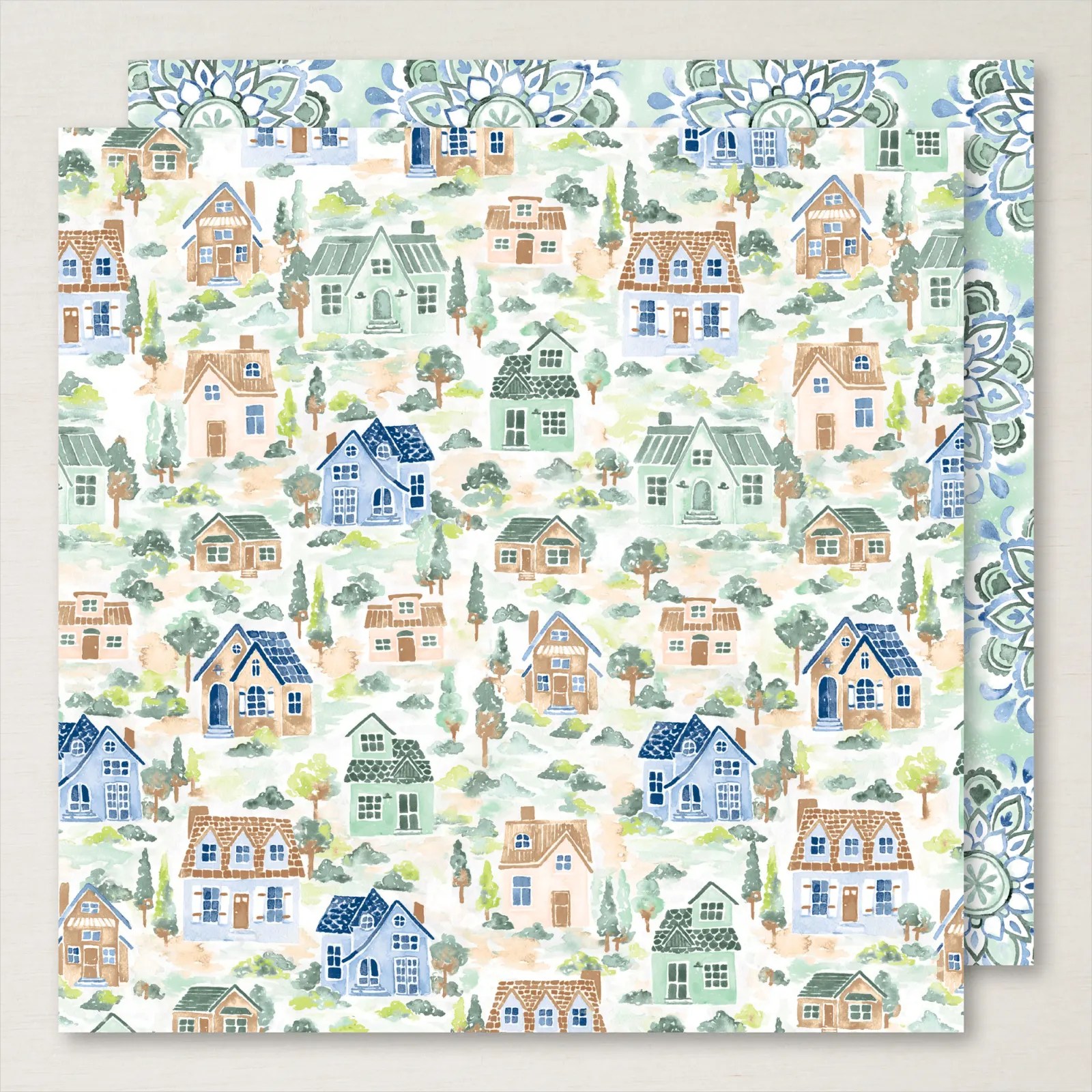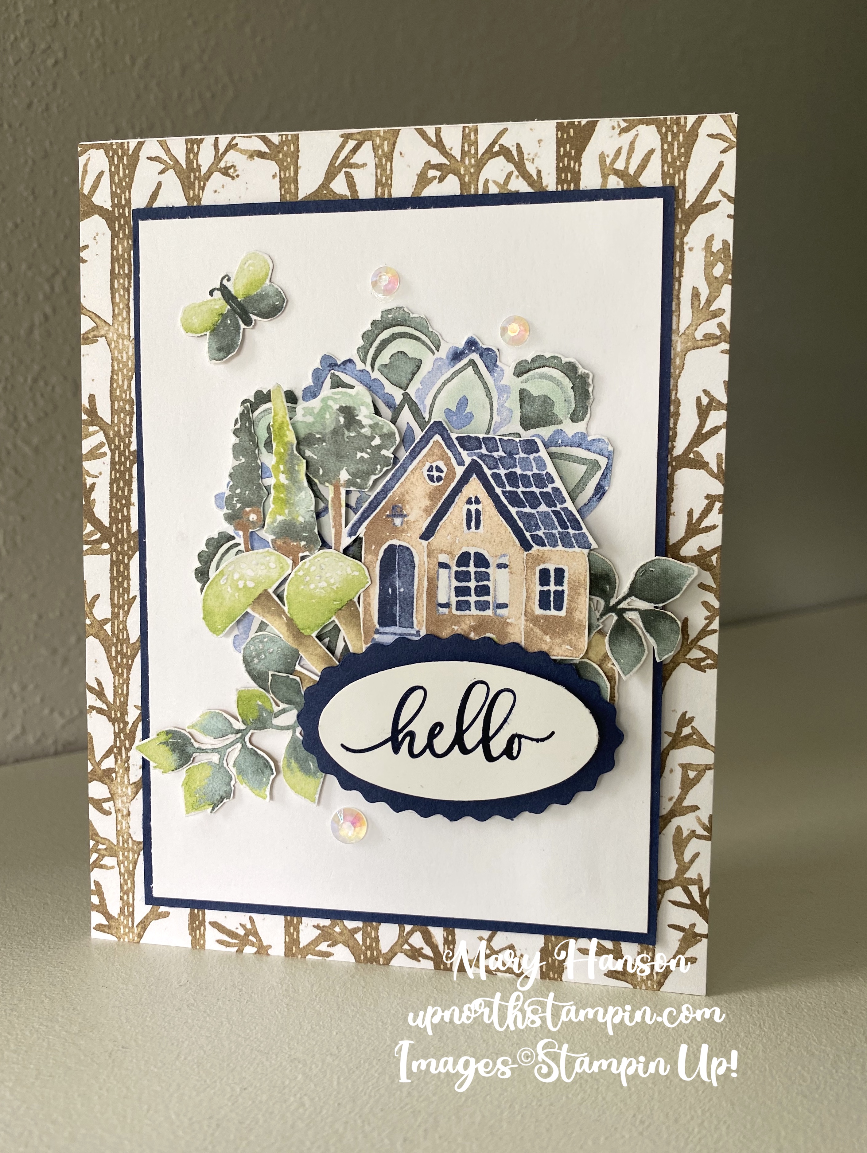 I started with a Basic White card base, and added a panel from one of the paper designs in the set. I then started adhering layers of the house scenes, some popped up with Stampin’ Dimensionals, to make the cute little vignette. I added a sentiment from a retired stamp set called “Life is Beautiful” and punched out the sentiment and a Night of Navy scrap with the Double Oval Punch. I finished off with some Iridescent Rhinestones. Thanks again, Yvonne, for a fun card!