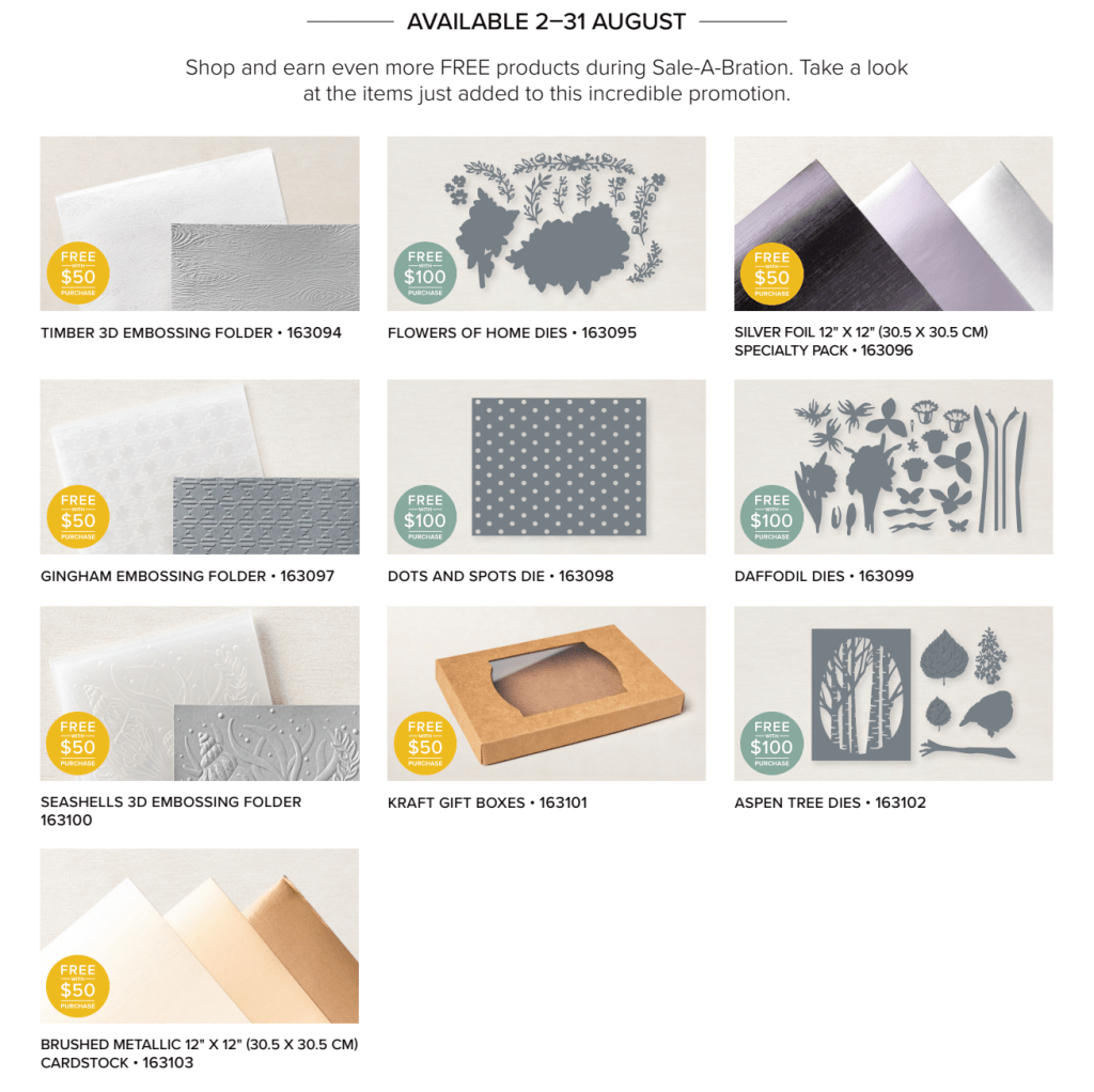 Woohoo! Stampin’ Up! has added some additional items that you can earn for FREE with orders beginning at $50 during Sale-a-bration! You can see the new items in this flyer (click on the image to open in a printable PDF format):