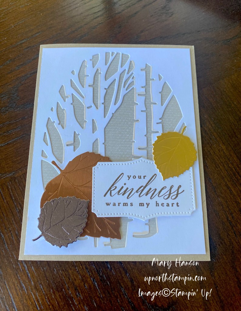 Yesterday, I featured my first card using the new Perched in a Tree Bundle, featuring a cute bird, beautiful leaf dies, and a background die that reminds me of our own land, filled with woods and beautiful trails. Here’s my second card, with a flavor of Autumn, which is right around the corner for us in Northern Minnesota.