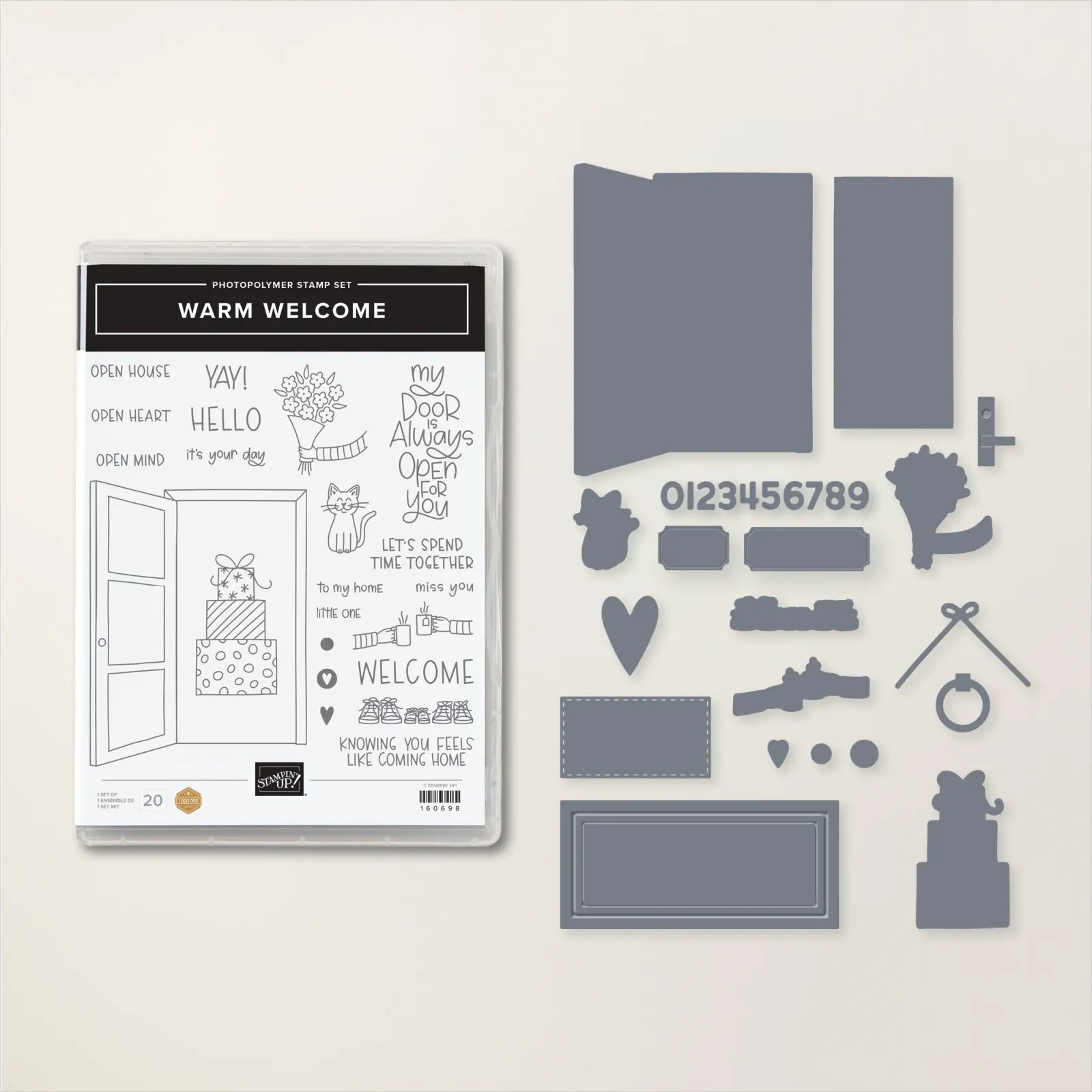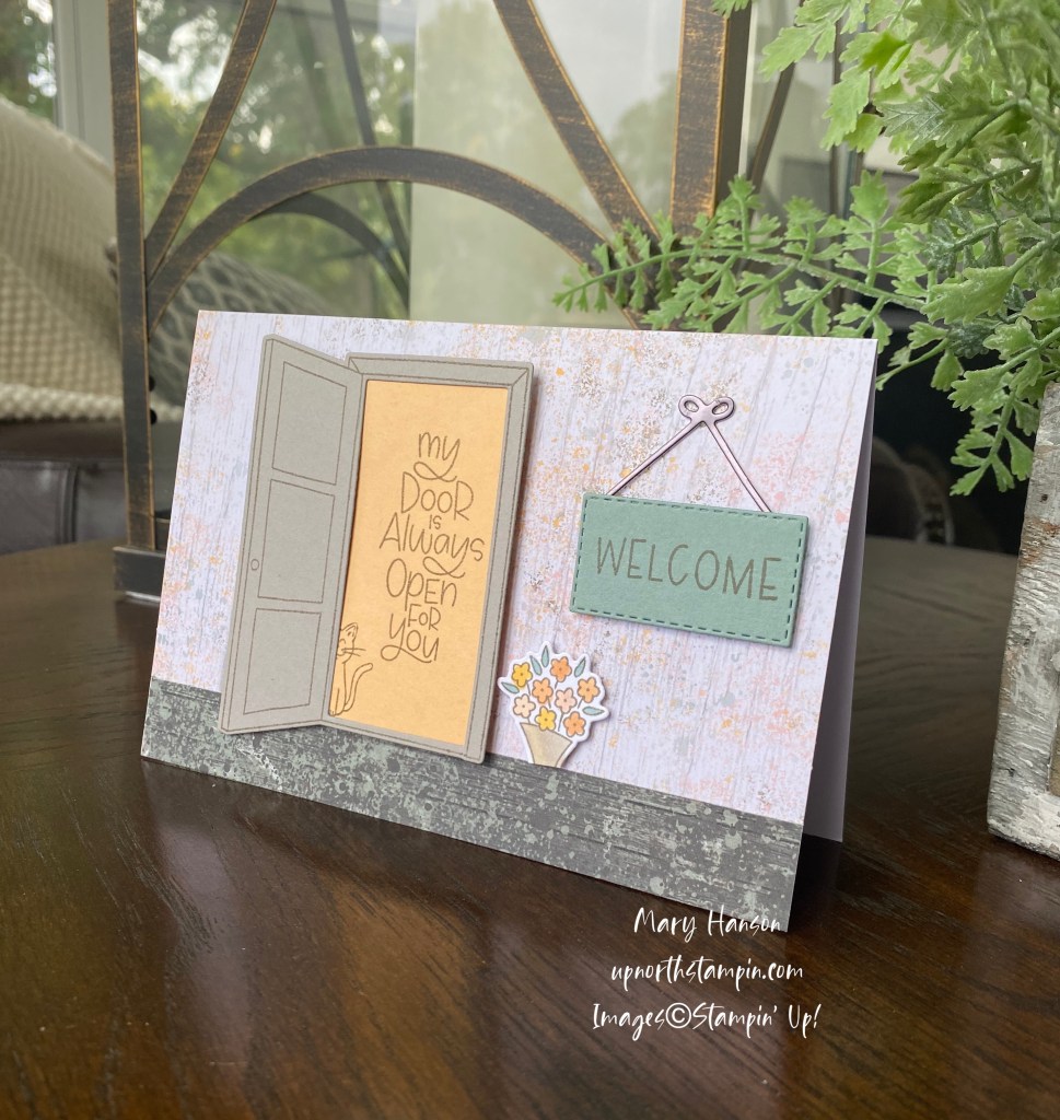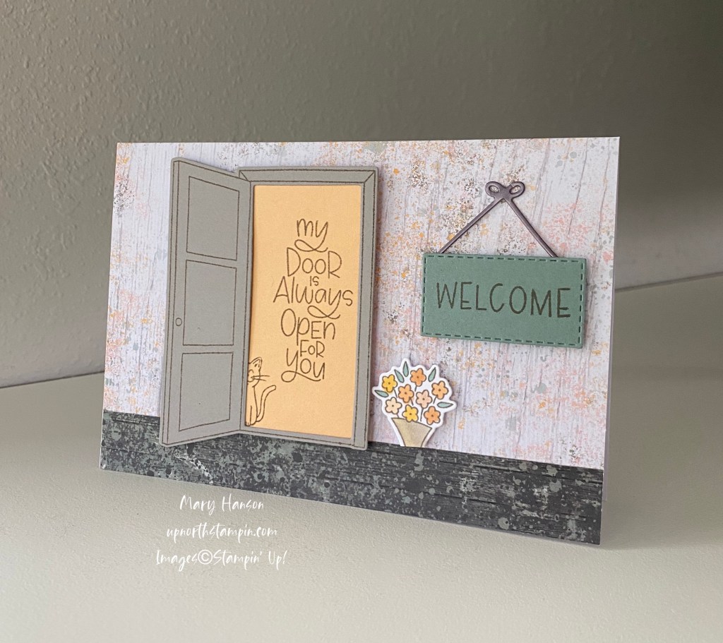 There’s a brand new bundle out from Stampin’ Up! called “Warm Welcome.” It features a door and all kinds of options for creating a scene for an entryway, either an interior or exterior. The coordinating dies allow you to cut out a welcome mat, a sign, a cute kitty, a floral bouquet, and much more. Here’s the first card I created for our Stampin’ Club!