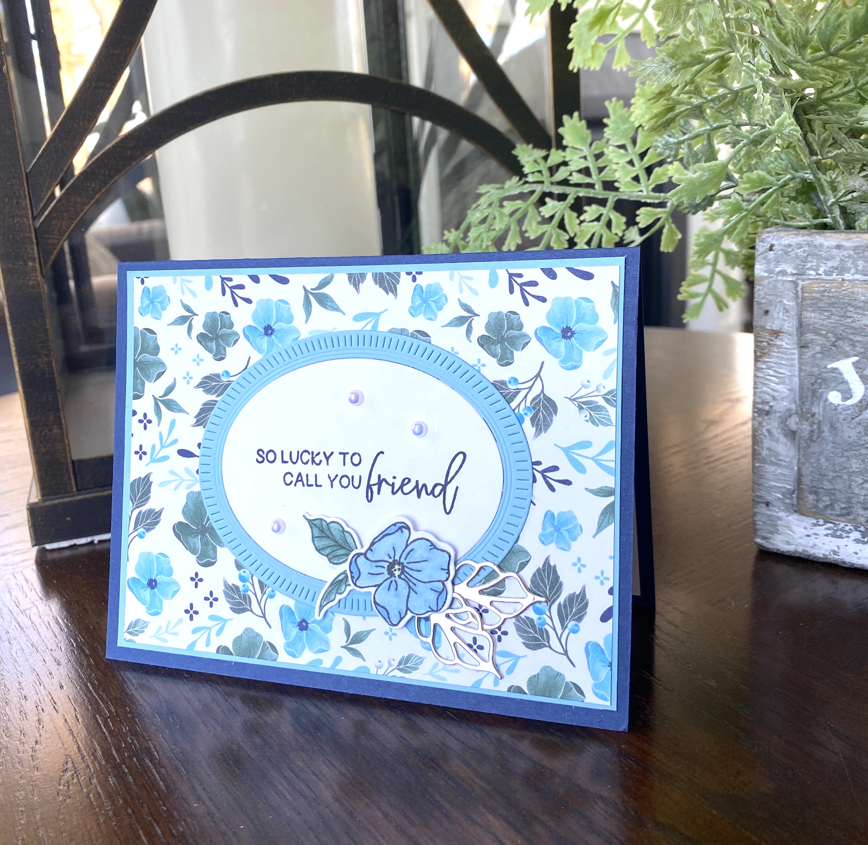 I stamped and then colored a small flower and leaves and used Balmy Blue and Soft Succulent Stampin’ Blends to color them in. I accented with two diecut leaves in Silver Foil, and three Iridescent Pearl embellishments.