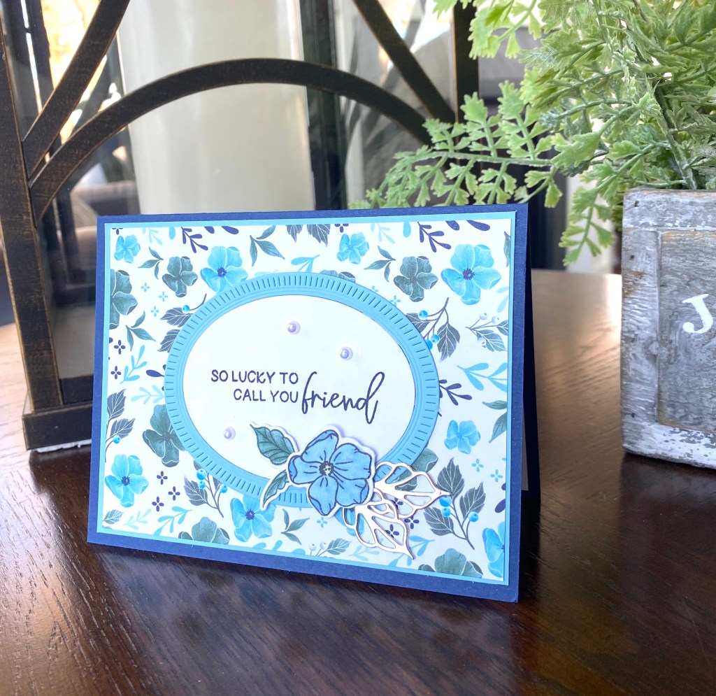 This card started with a card base of Night of Navy and then a slightly smaller panel of Balmy Blue. I cut out two of the oval diecuts — one in Balmy Blue, and one in Basic White. I then mixed and matched to get the effect above. The sentiment was stamped in Night of Navy and simply placed in the middle.