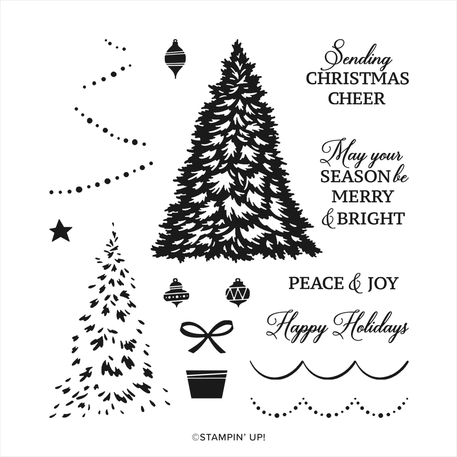 | Happy Holidays Card (4-1/4″ x 5-1/2″) BEGINNER To create the beginner version of our Happy Holidays card, start by folding Soft Succulent Cardstock in half; stamp the Christmas tree and ornament images in Soft Succulent ink. Tie the Basic White Cardstock layer with Baker’s Twine, then adhere it to the card front. Add a simple sentiment and a few sparkling Champagne Rhinestones to complete this simple yet elegant card. CASUAL We stepped up our second card by leveraging the two-step stamping option and adding depth and dimension with contrasting pine boughs stamped in Evening Evergreen ink. We included a shabby chic element by cutting the Basic White Cardstock layer with one of the Deckled Rectangles Dies. AVID To create our most stepped-up card, we added a few extra layers, copper embossing, a fancy tag made using Basic White Cardstock and the Meadow Dies, and a bit of White 3/4″ (1.9 cm) Frayed Ribbon. Notice how the use of Stampin’ Dimensionals really makes the Christmas tree pop out! The Trimming the Tree Stamp Set is one you’ll use year after year, so be sure to add this timeless set to your holiday stamp stash soon! The products you’ll need to make these projects can be found below! Here is this beautiful stamp set: |
