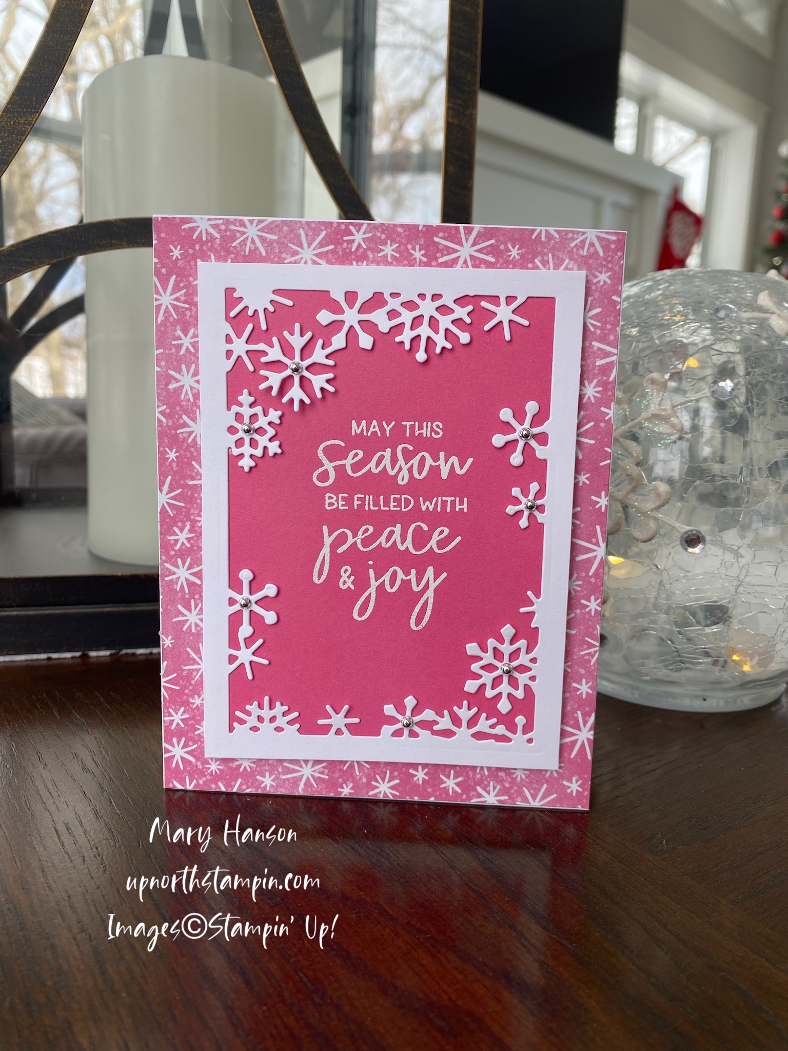The card above is a simple one. I adhered a panel of Celebrate Everything DSP (a host set of DSP!) over a Basic White card base. I cut out a framed piece from the Snowman Dies, and also used my Stampin’ Trimmer to cut a panel of Polished Pink to fit underneath it. I adhered the snowflake frame onto the polished pink, but before attaching to the card base, I heat embossed a sentiment from the Framed and Festive stamp set in white embossing powder. I attached the pink panel to the card base, and then just finished it with some Festive Pearls in the silver tones. So easy and bright!