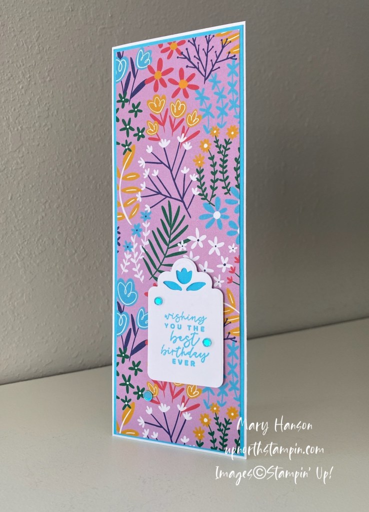 I needed a slimline card to send some embellishments, so I decided to create one with some new papers. The Flowers & More Designer Series Papers. I created two cards using these papers, both with the same basic layout:
