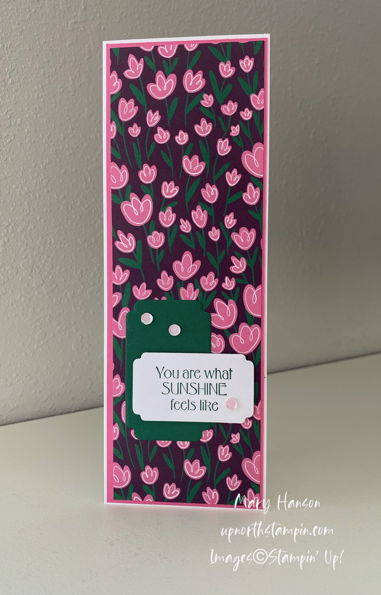 I needed a slimline card to send some embellishments, so I decided to create one with some new papers. The Flowers & More Designer Series Papers. I created two cards using these papers, both with the same basic layout: