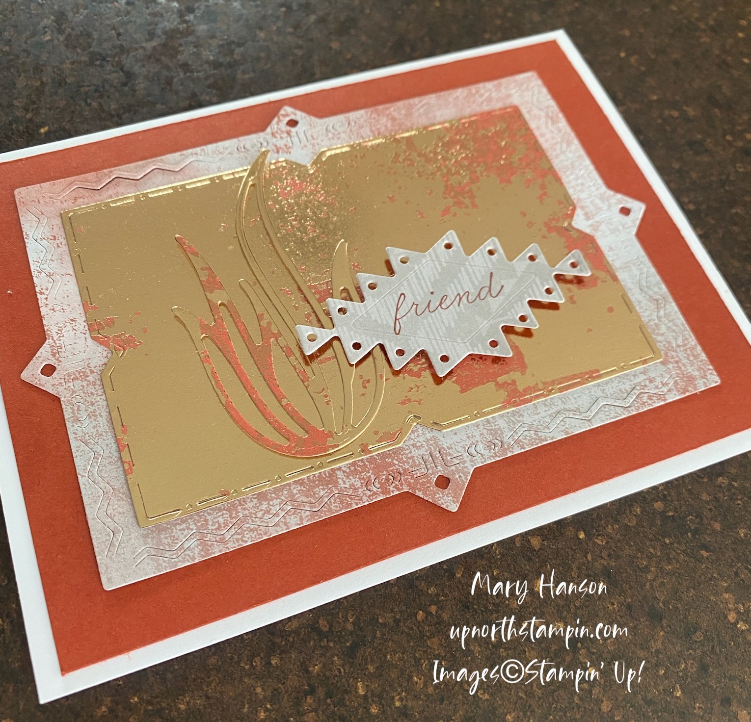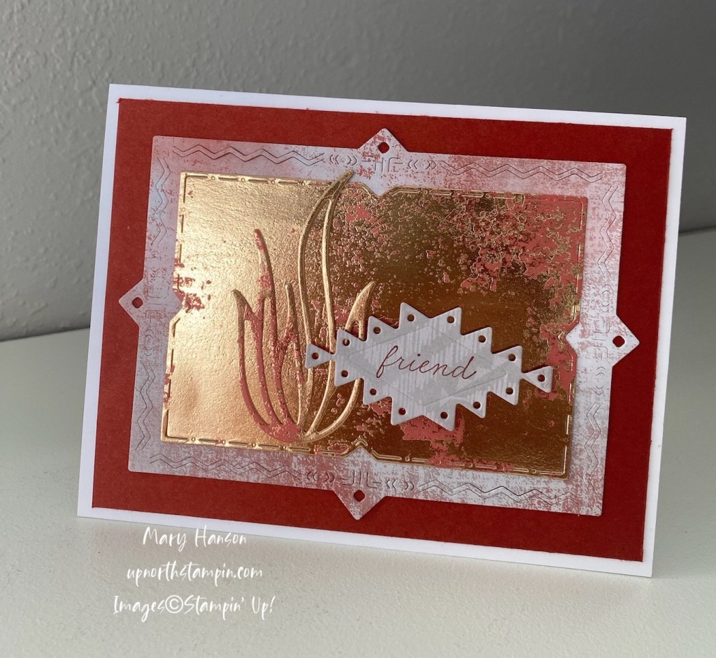 The Dry Brushed Metallic Specialty DSP is the star of the show on this card. It is beautiful, and brand new in the January-April Mini Catalog. It comes in two colors. I used one of the dies from the bundle to cut out a beautiful shiny layer along with a die that looks like a desert succulent, and one die to cut a bigger layer from one of the Delicate Desert DSP. I love the little cutout details — aren’t they so cool? I also cut out one geometric shape die for the sentiment and used Cajun Craze ink for that. Other measurements: