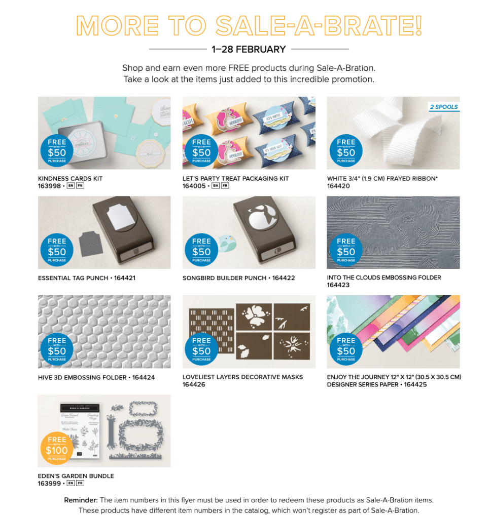 Yay! Stampin’ Up! has some new items to pick from at the $50 level and $100 level during Sale-a-bration! They are all items from the current catalog and they’re all available in addition to the Sale-a-bration exclusives from the Sale-a-bration 2023 Brochure!