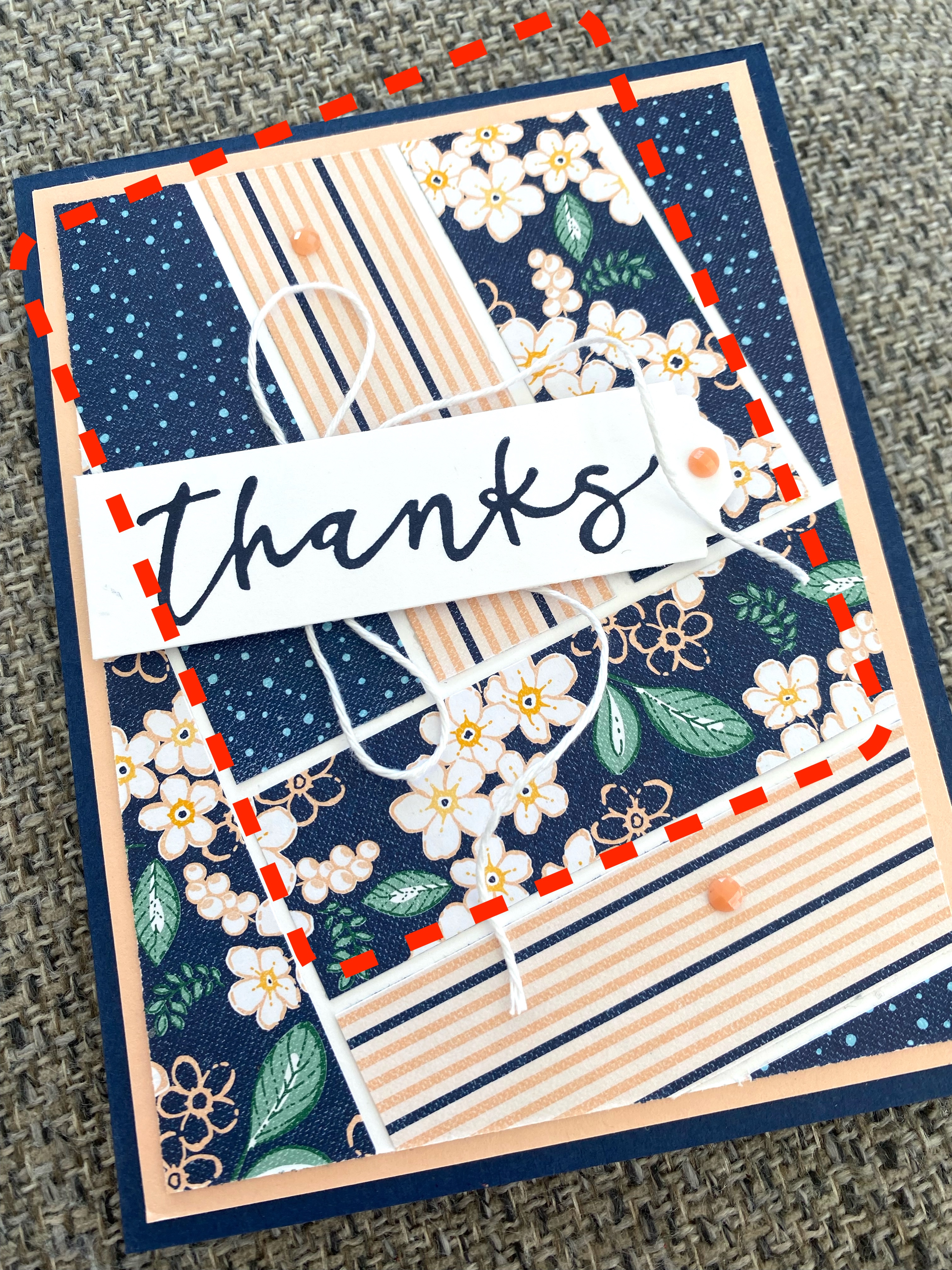 I then started adhering the strips to the white panel which has not been attached to the card yet! I placed them, just ‘eyeing up’ the gap between each strip. I started with these four, (see dotted line below), and then pieced the others in. Once you get the hang of it, it goes fast for multiple cards.