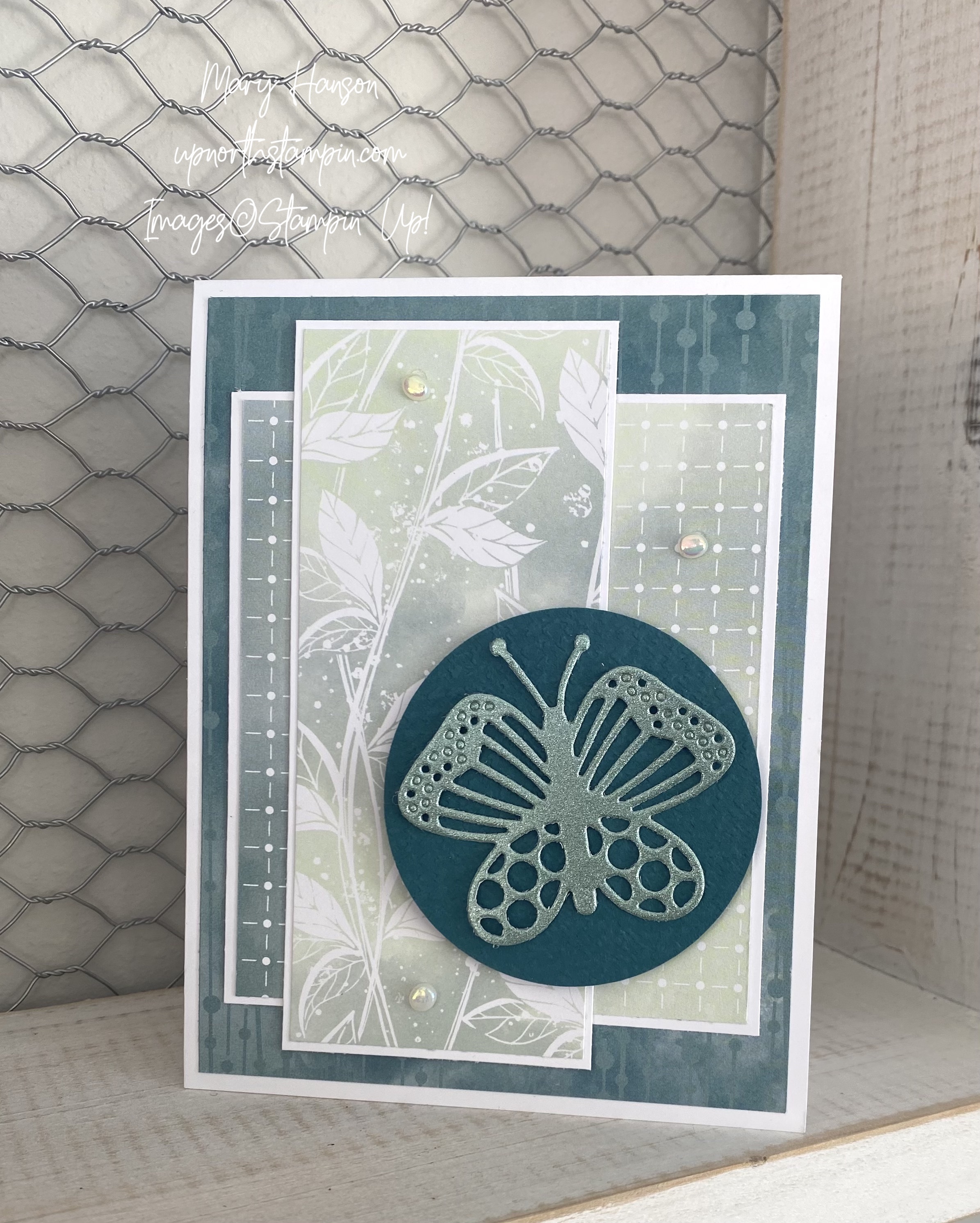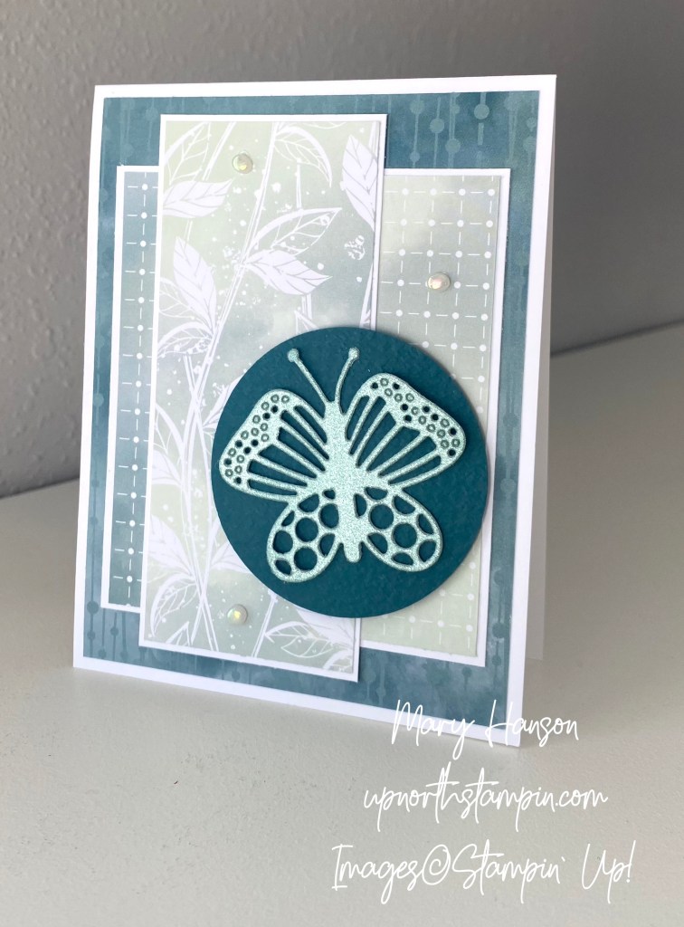 I adhered the panels together and then adhered to the card front. I popped the circle up with Stampin’ Dimensionals, and then added the butterfly with glue dots. I finished with some pretty Iridescent Flat Pearls.