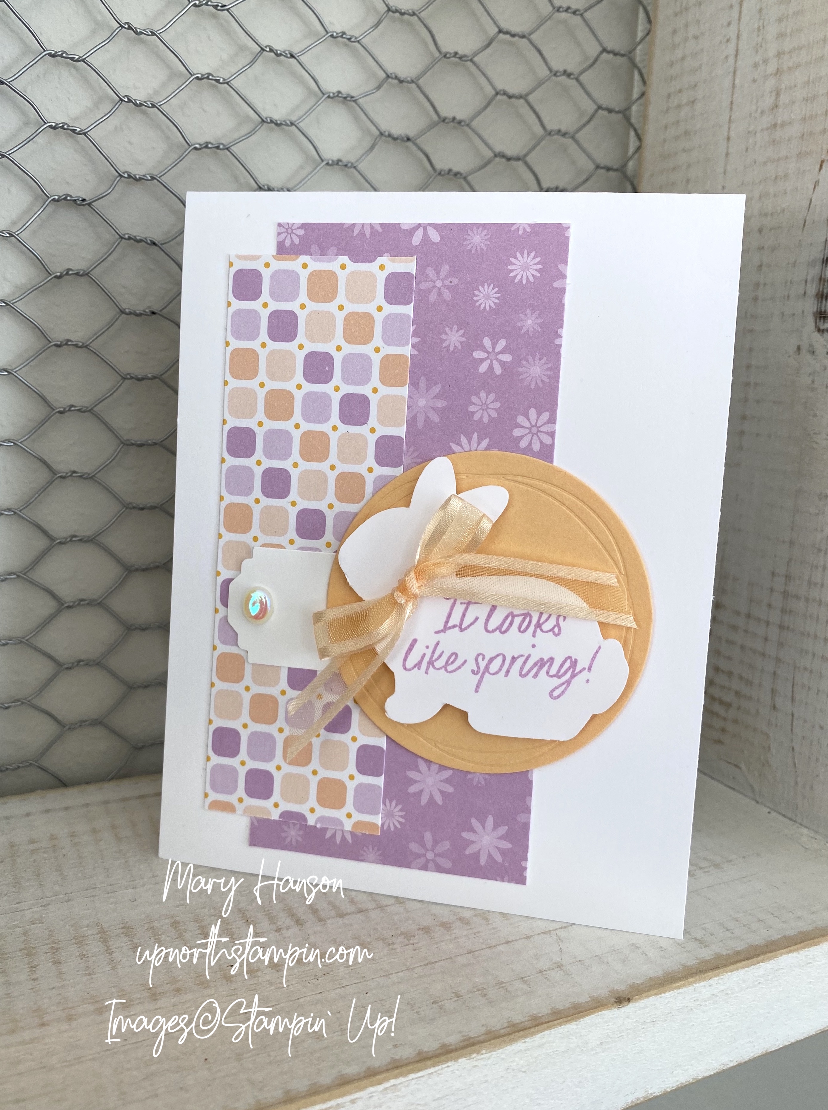 - Basic White card stock, punched out with the Easter Bunny punch, then decorated with a bow of Pale Papaya 3/8″ Open Weave Ribbon