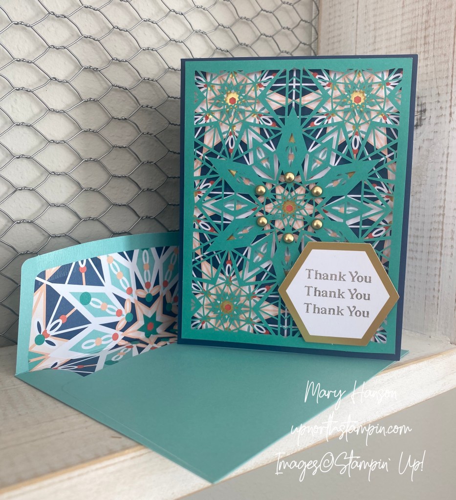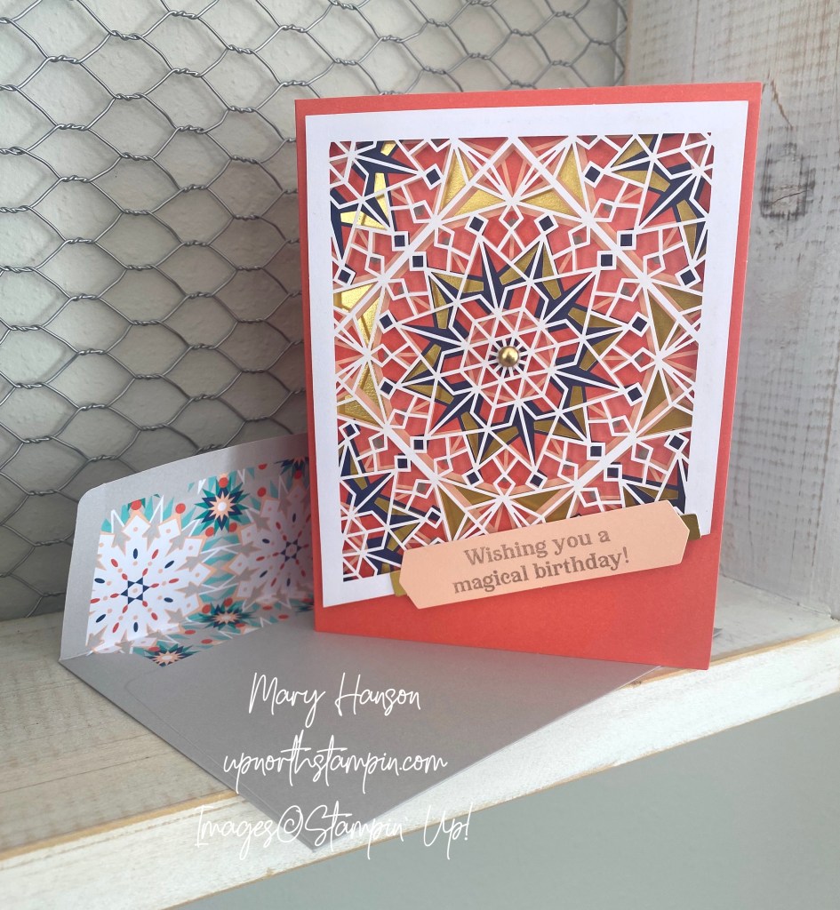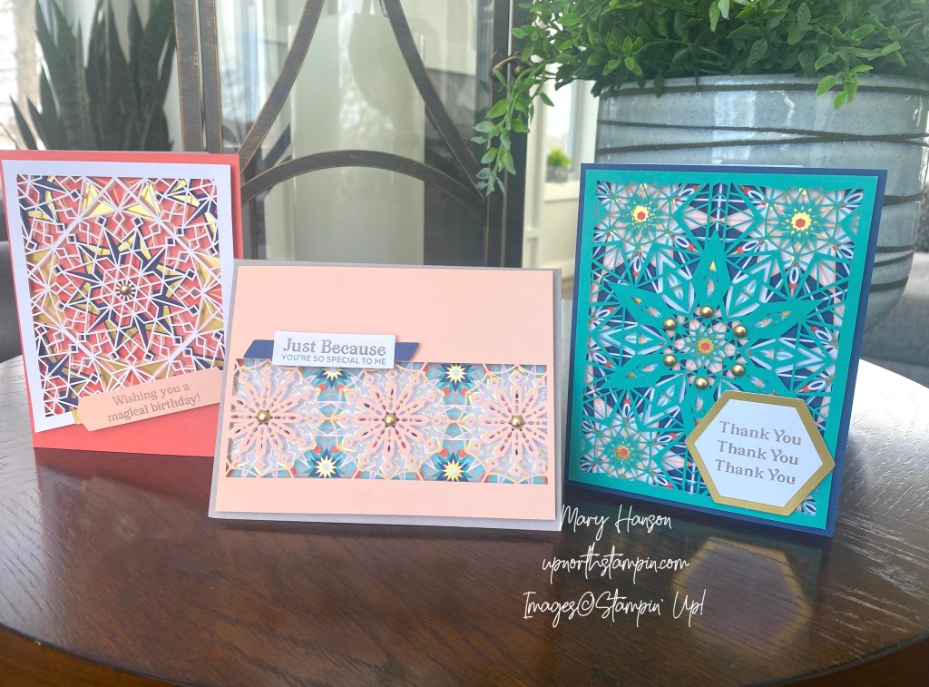 Do you remember looking through kaleidoscopes when you were younger? I used to love turning the little dial, watching the colors and patterns change. Stampin’ Up! has some wonderful kits available online right now, and one of them is the Colorful Kaleidoscope kit. This kit includes everything you need to create nine cards, three each of three different designs. Here are the three cards: