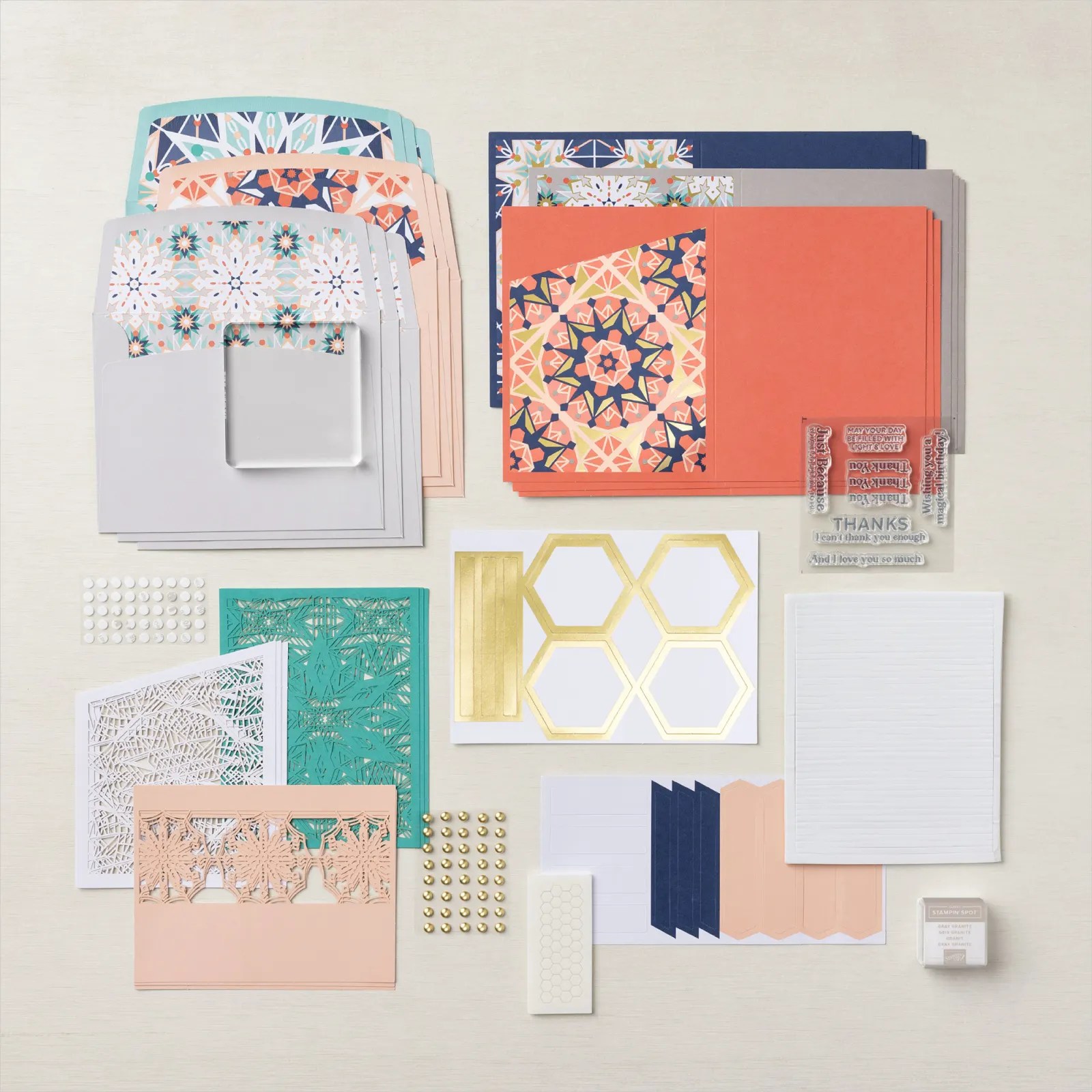 Aren’t these cards fun, and SO colorful! It’s difficult to see, but the layers create a 3-D effect, much like a kaleidoscope! Here is what you get inside the kit, as well as a close-up of the stamp set.