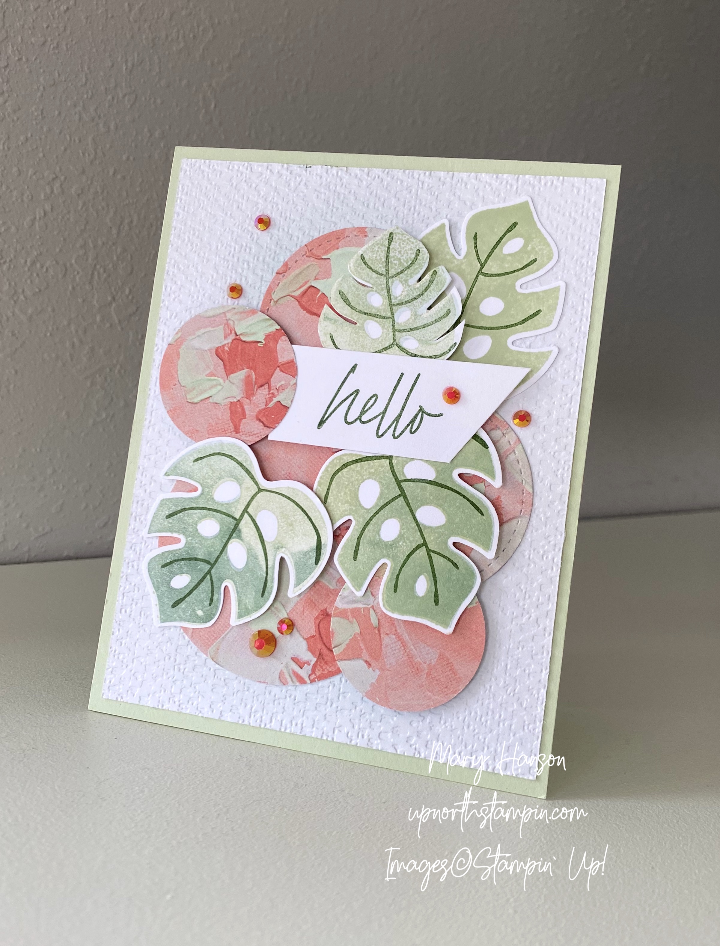 I love a good punch, and the new Tropical Leaf Bundle, complete with stamp set and punch, does not disappoint. I created a card using this fun punch and a beautiful piece of designer series paper from the Fancy Flora set of papers.